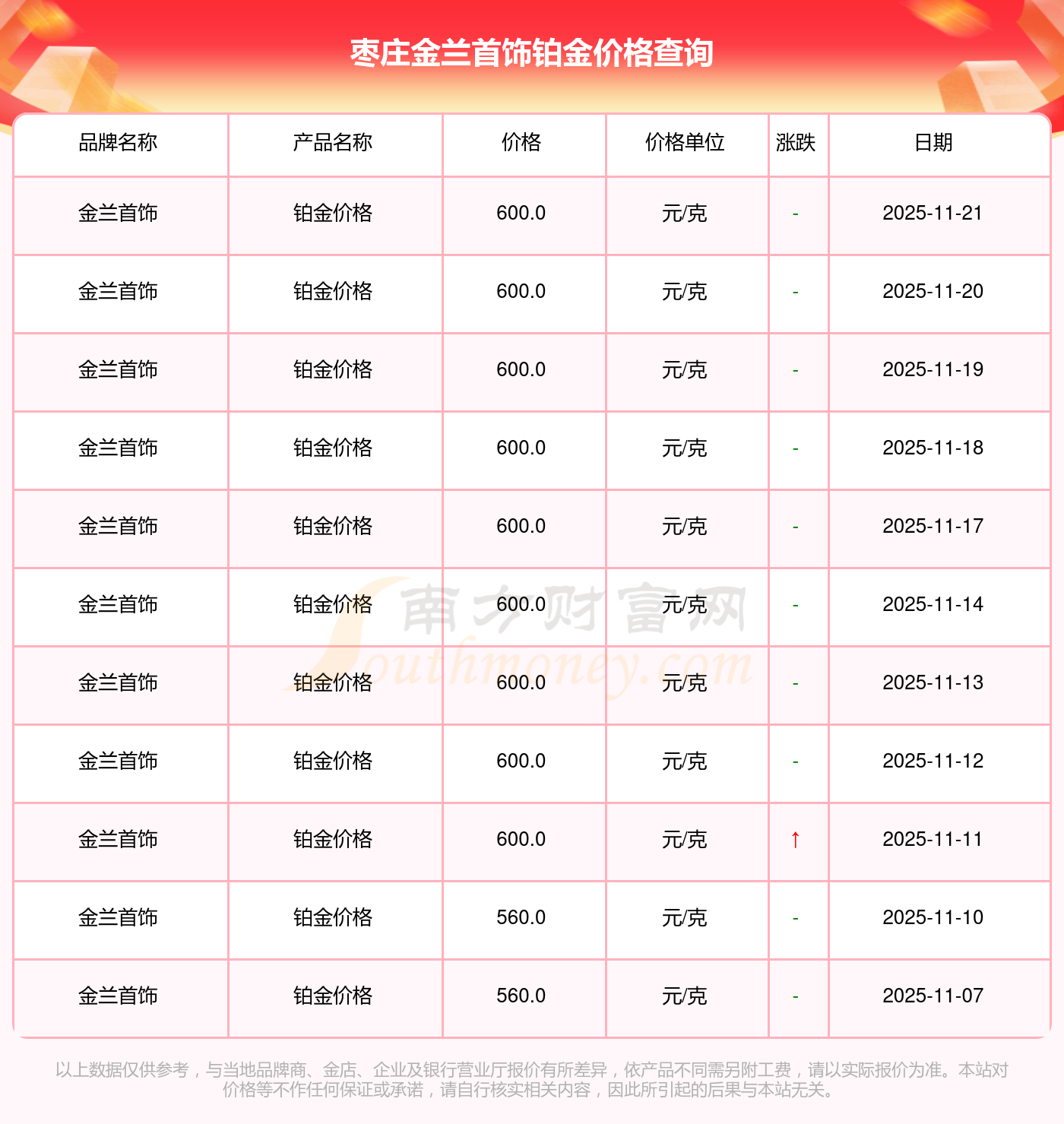 枣庄金兰首饰 2025年11月21日的铂金价格价位为 600.0元/克。