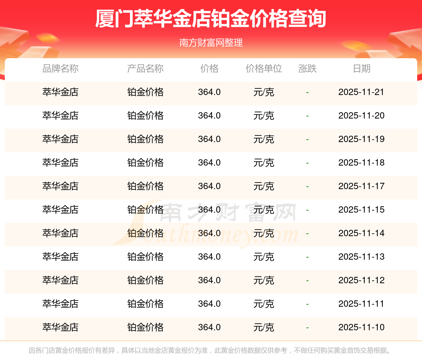 于 2025年11月21日,厦门萃华金店铂金价格的克价为364.0元/克。