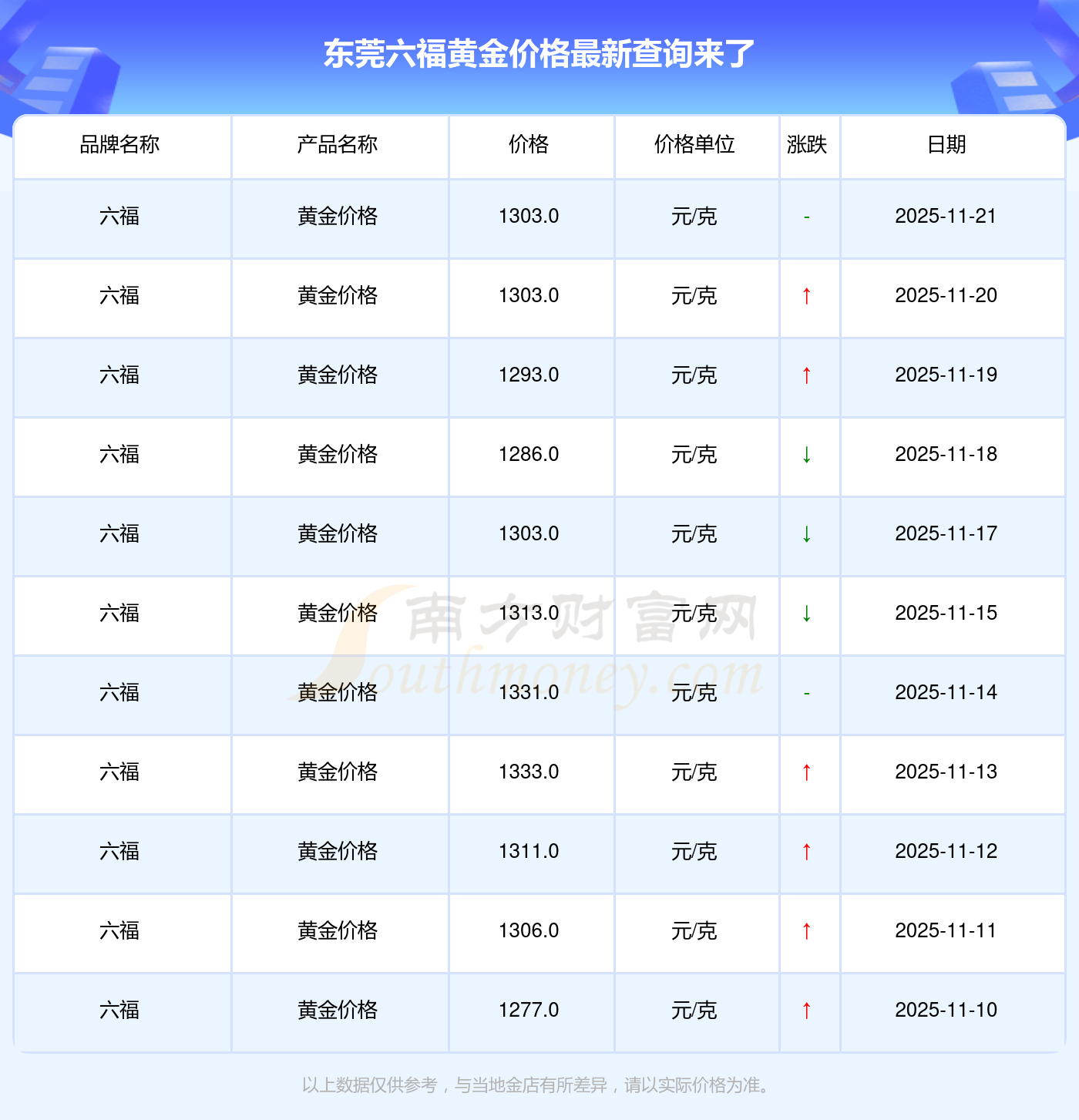2025年11月21日,东莞六福所售黄金价格,其价格设定为 1303.0元/克。