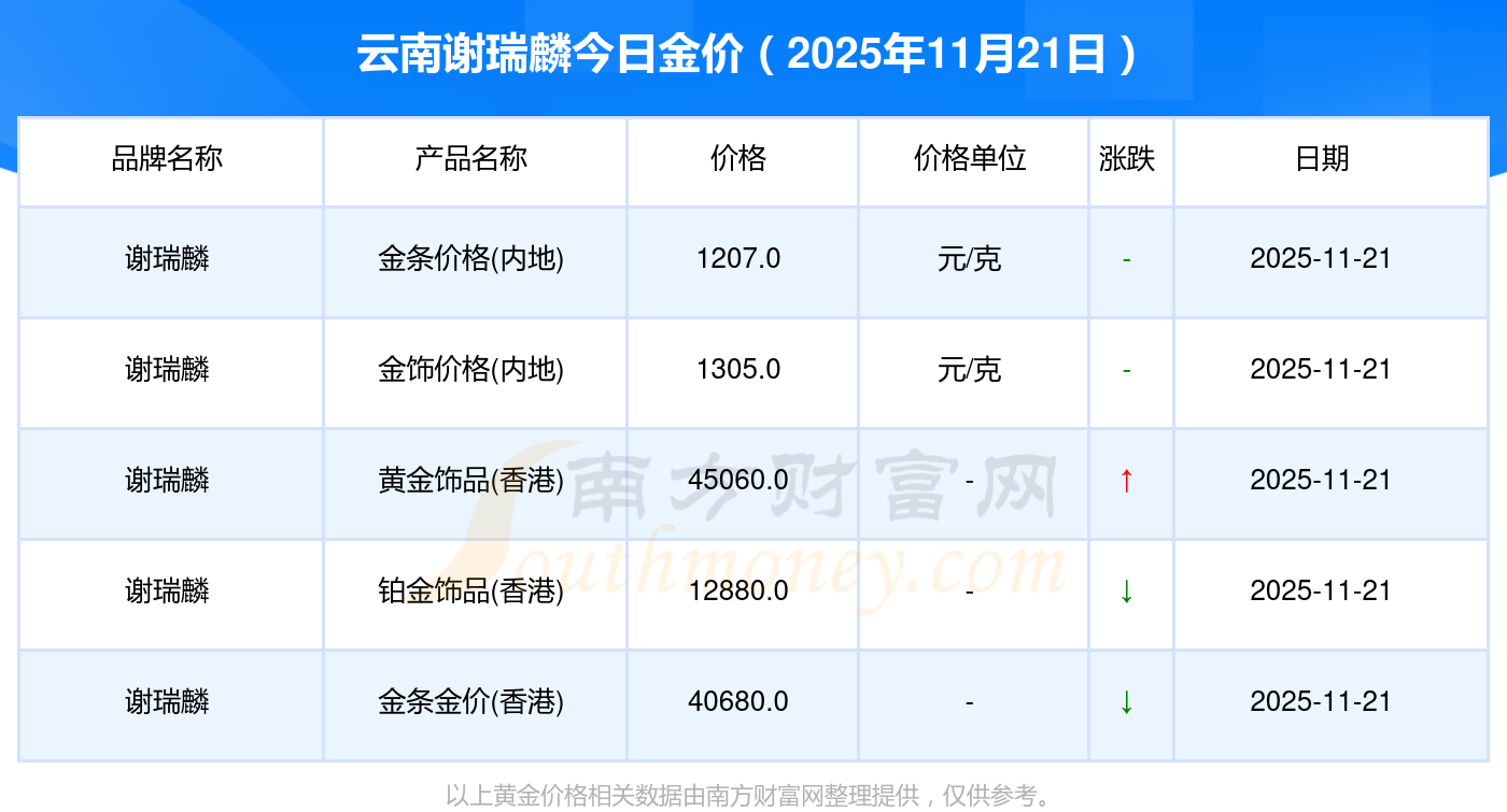 2025年11月21日云南谢瑞麟今日价格:黄金价格1305.0元/克,铂金价格616.0元/克,饰品金价(内地)1305.0元/克,黄金饰品(香港)45110.0,铂金价格(香港)17570.0,金条价格(香港)40690.0,金条金价(内地)1143.0元/克,黄金价格1298.0元/克,铂金价格600.0元/克,足金价格1298.0元/克,黄金价格1266.0元/克。