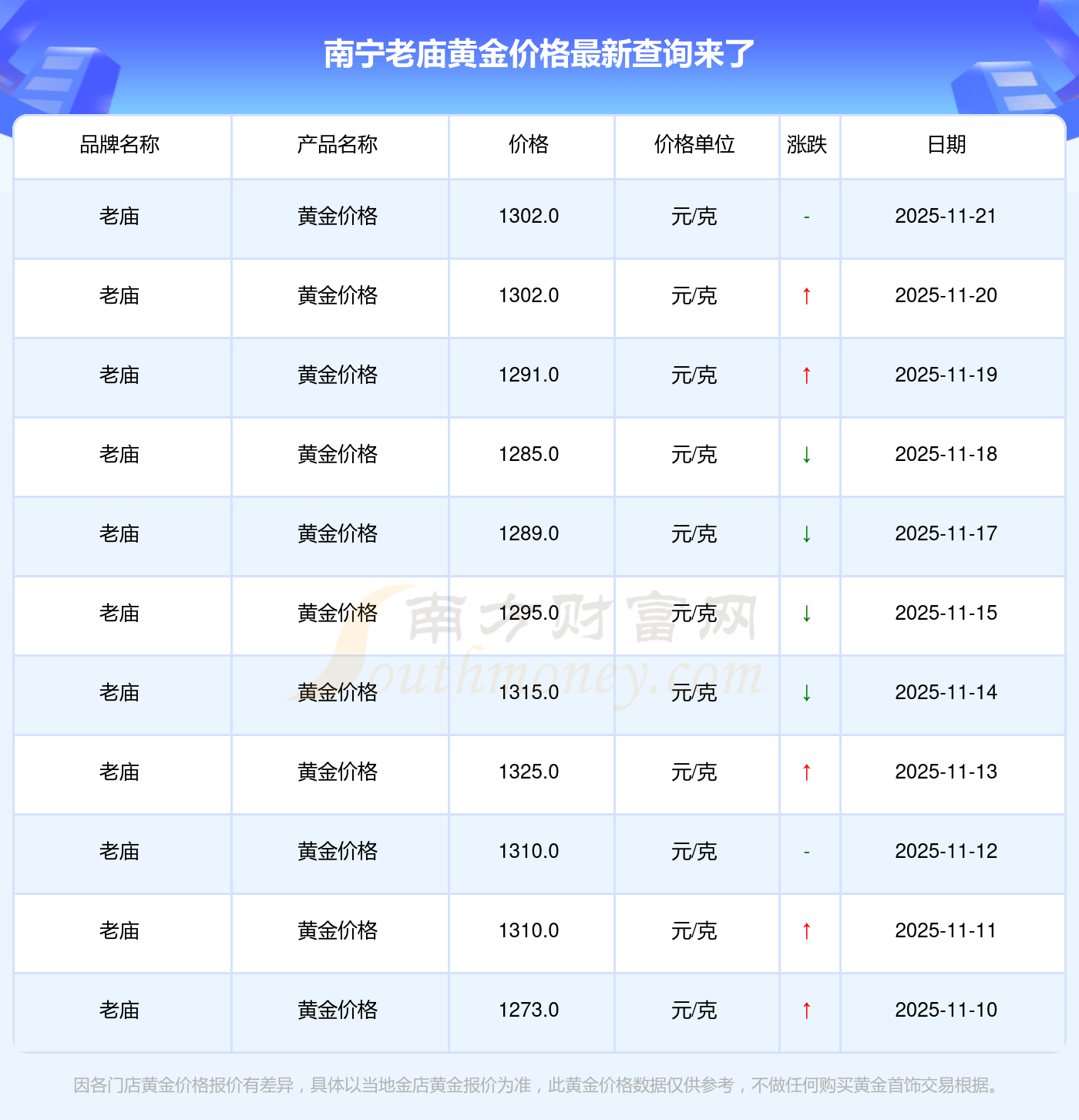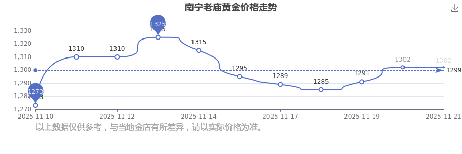 今日(2025年11月21日)南宁老庙黄金价格是1302.0元/克。