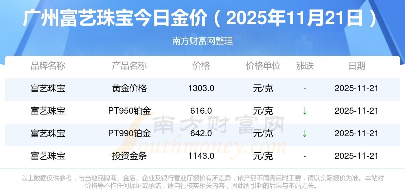 今日黄金价格查询_现在金价黄金一克多少钱,黄金价格是多少钱一克?广州富艺珠宝每克黄金在市场上卖多少钱:黄金价格1305.0元/克,铂金价格616.0元/克,饰品金价(内地)1305.0元/克,黄金饰品(香港)45110.0,铂金价格(香港)17570.0,金条价格(香港)40690.0,金条金价(内地)1143.0元/克,黄金价格1298.0元/克,铂金价格600.0元/克,足金价格1298.0元/克,黄金价格1266.0元/克。