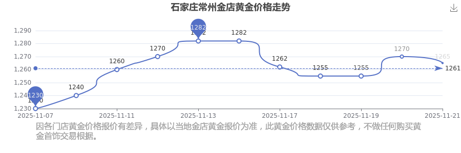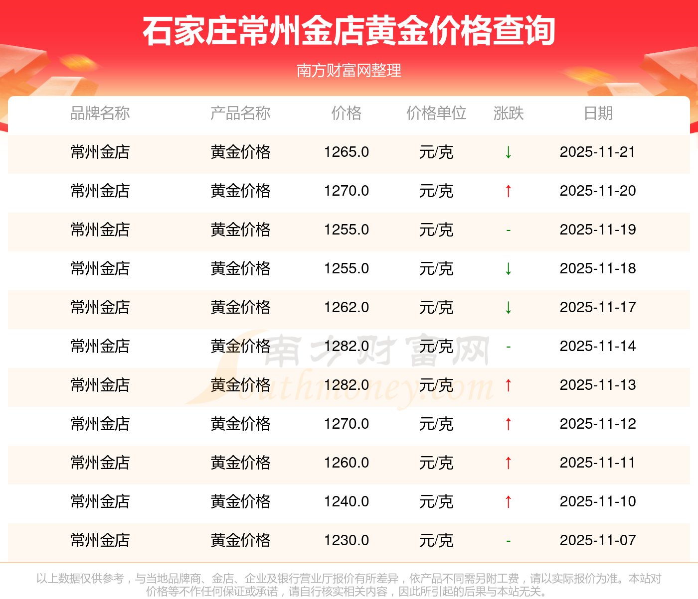 今日(2025年11月21日),1265.0元/克是石家庄常州金店黄金价格的价格标准。