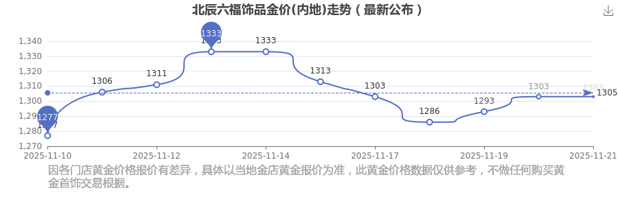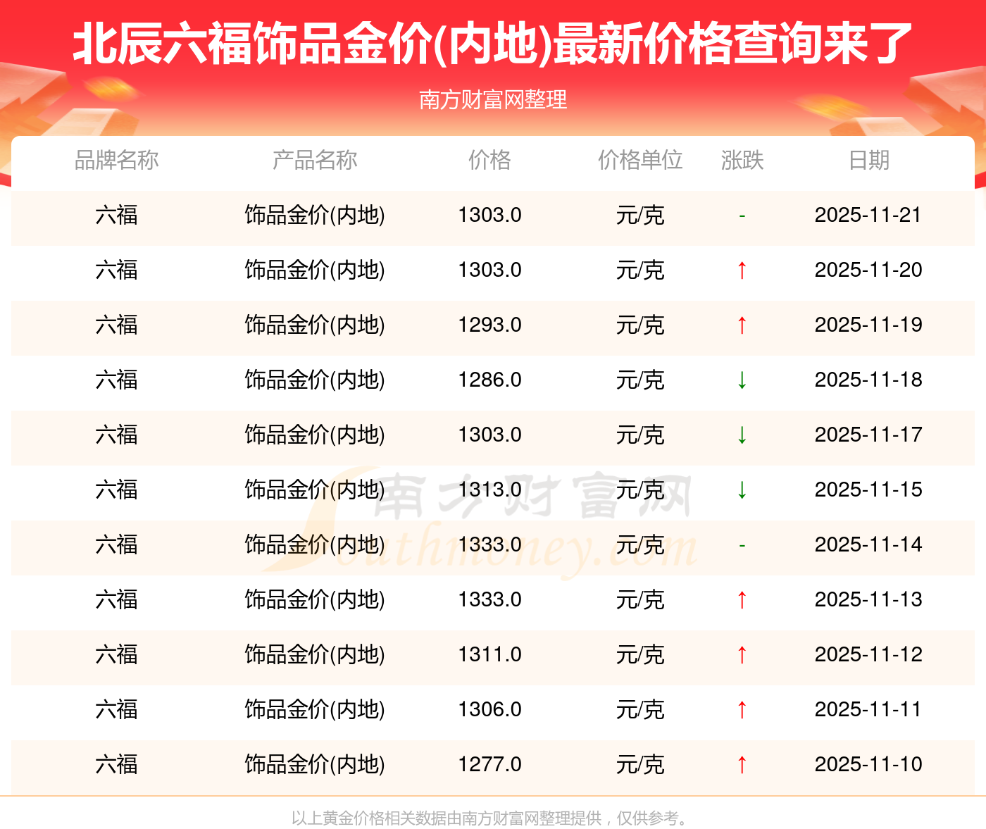 今日(2025年11月21日),北辰六福饰品金价(内地)的价格是1303.0元/克。
