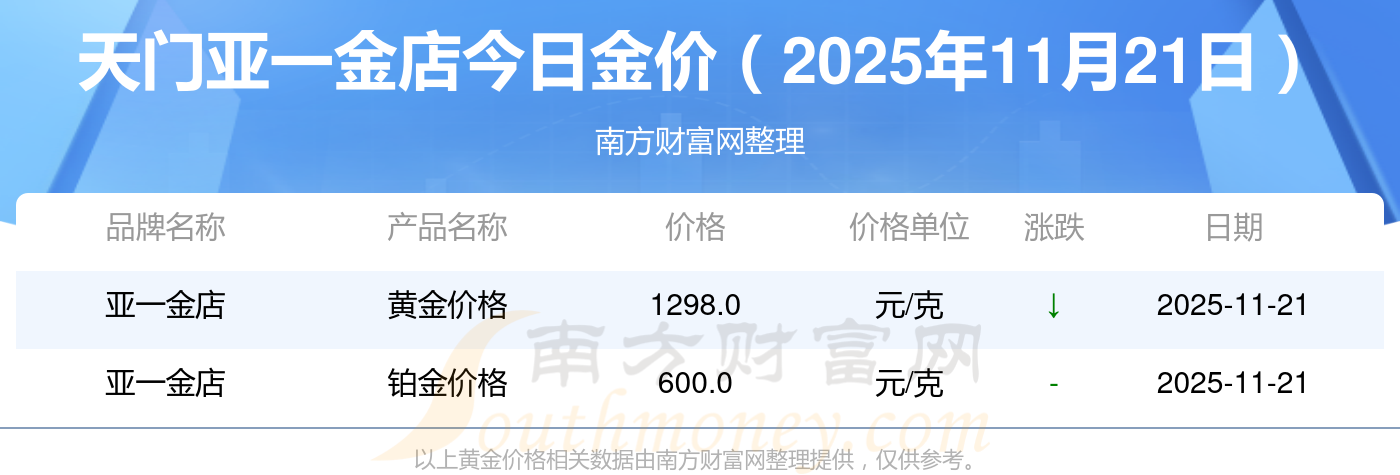 黄金价格1305.0元/克,铂金价格616.0元/克,饰品金价(内地)1305.0元/克,黄金饰品(香港)45110.0,铂金价格(香港)17570.0,金条价格(香港)40690.0,金条金价(内地)1143.0元/克,黄金价格1298.0元/克,铂金价格600.0元/克,足金价格1298.0元/克,黄金价格1266.0元/克。