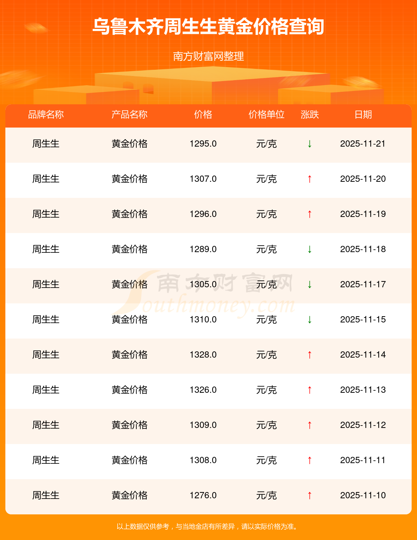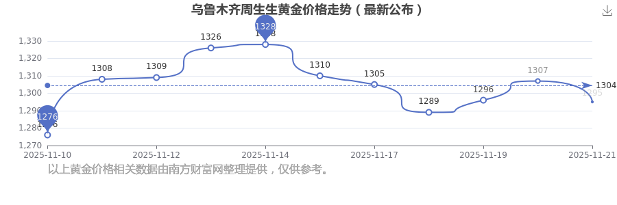 今日(2025年11月21日),乌鲁木齐周生生黄金价格的定价为 1295.0元/克。