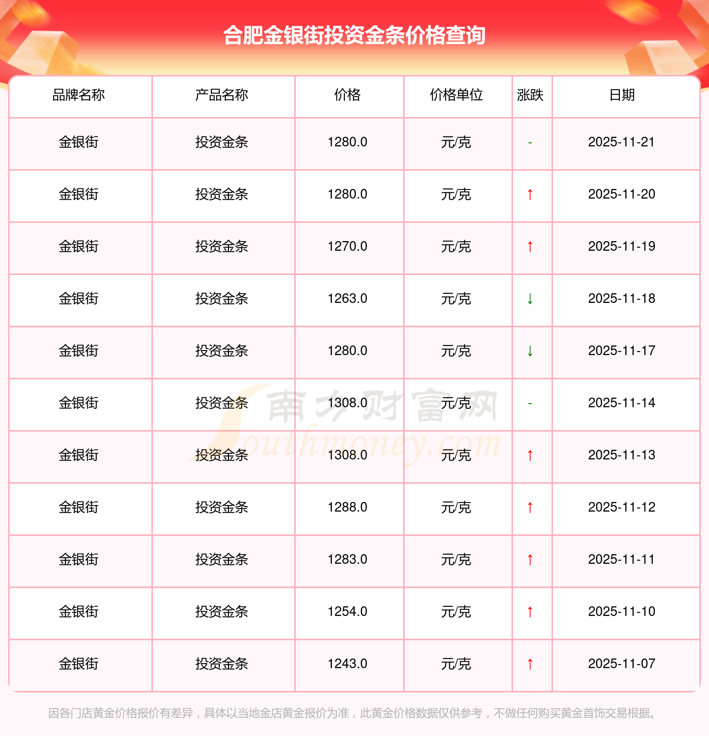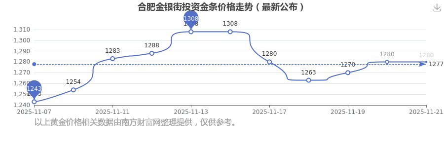 今日(2025年11月21日),合肥金银街投资金条的价格是1280.0元/克。