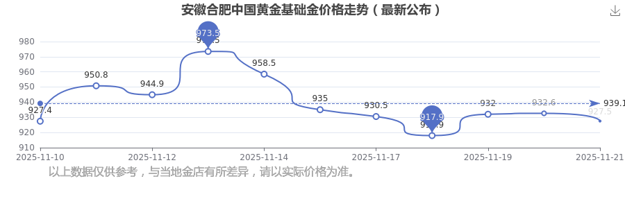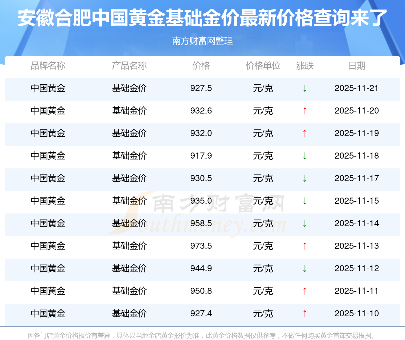 2025年11月21日,安徽合肥中国黄金所售基础金价,其价格设定为 927.5元/克。