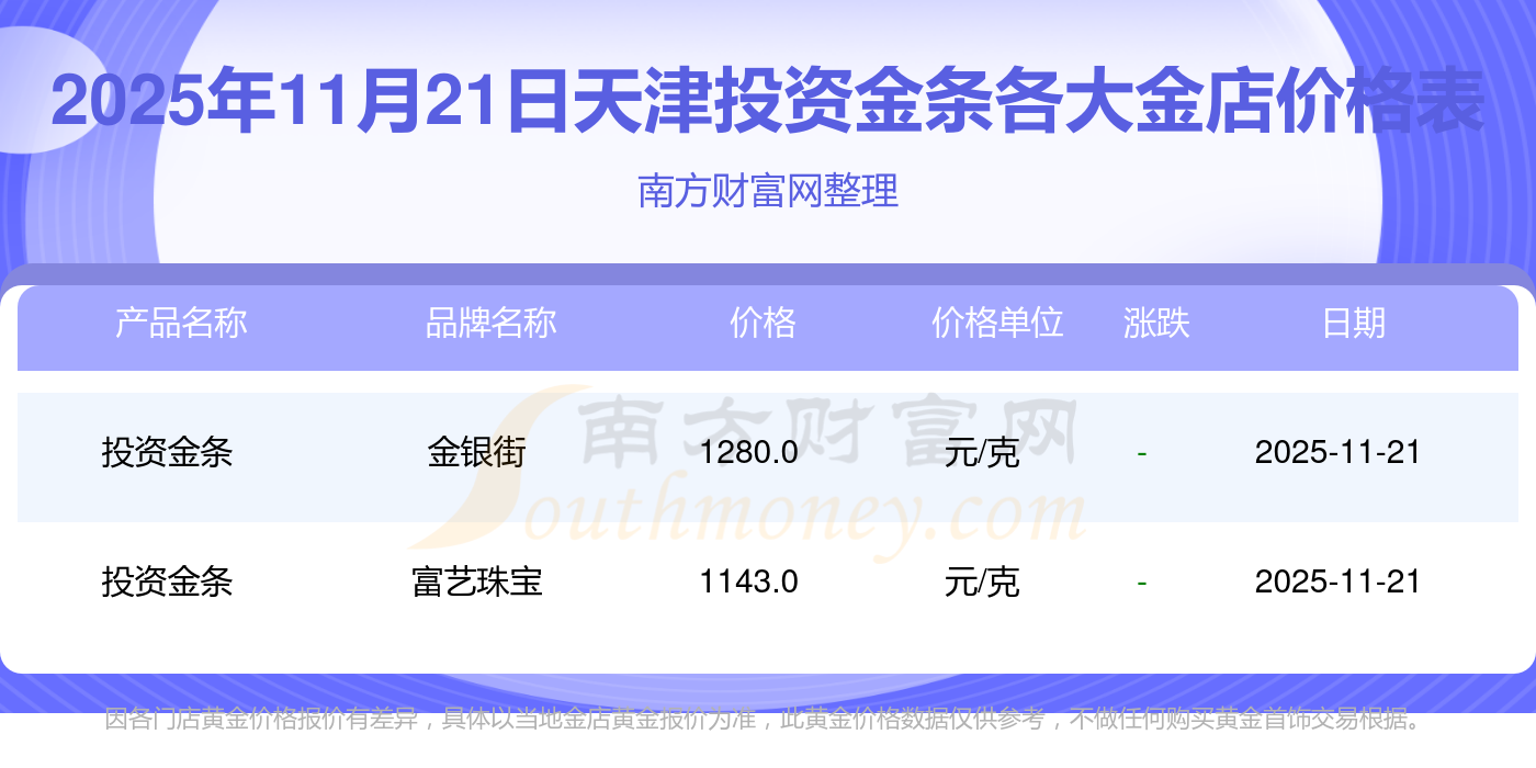 2025年11月21日,天津周大福、周大福、周大福、周大福、周大福、周大福、周大福、老凤祥、老凤祥、老凤祥、周六福等各大金店品牌投资金条今日价格如下:周大福1305.0元/克、周大福616.0元/克、周大福1305.0元/克、周大福45110.0、周大福17570.0、周大福40690.0、周大福1143.0元/克、老凤祥1298.0元/克、老凤祥600.0元/克、老凤祥1298.0元/克、周六福1266.0元/克。