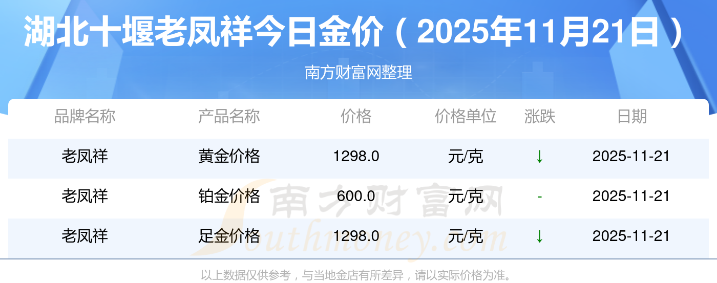 2025年11月21日湖北十堰老凤祥现在黄金一克要多少钱:黄金价格1305.0元/克,铂金价格616.0元/克,饰品金价(内地)1305.0元/克,黄金饰品(香港)45110.0,铂金价格(香港)17570.0,金条价格(香港)40690.0,金条金价(内地)1143.0元/克,黄金价格1298.0元/克,铂金价格600.0元/克,足金价格1298.0元/克,黄金价格1266.0元/克。