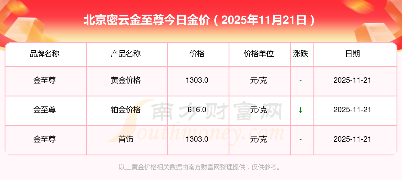 黄金价格1305.0元/克,铂金价格616.0元/克,饰品金价(内地)1305.0元/克,黄金饰品(香港)45110.0,铂金价格(香港)17570.0,金条价格(香港)40690.0,金条金价(内地)1143.0元/克,黄金价格1298.0元/克,铂金价格600.0元/克,足金价格1298.0元/克,黄金价格1266.0元/克。