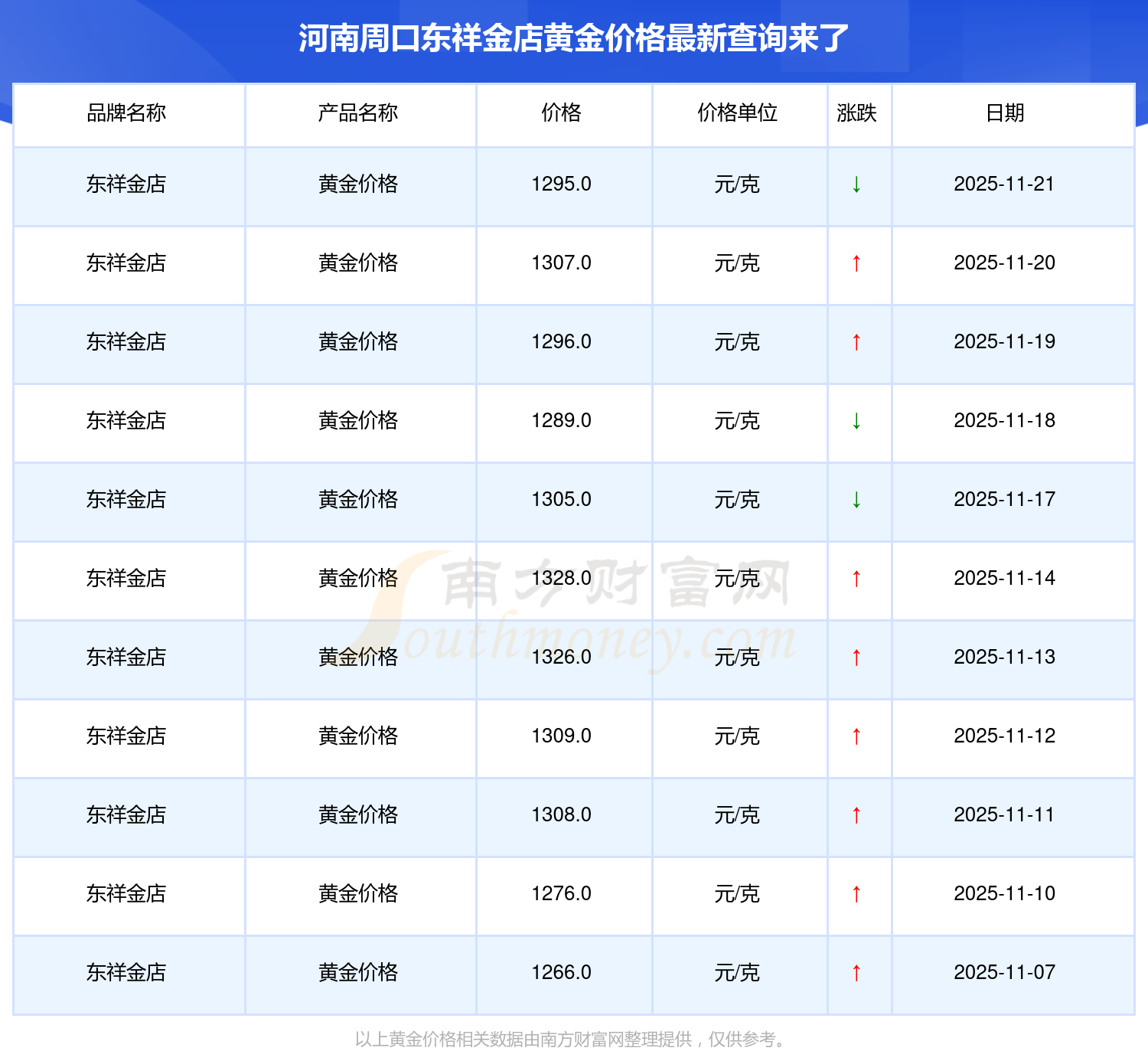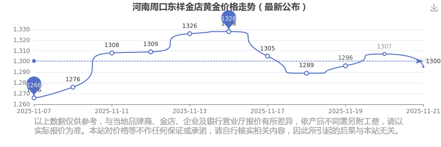 今日(2025年11月21日),河南周口东祥金店黄金价格的价格是1295.0元/克。