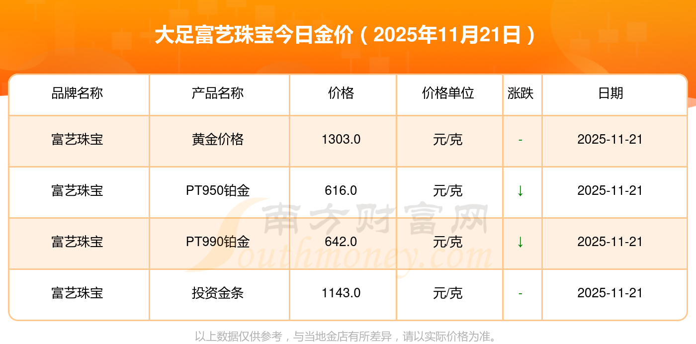 想查询今日黄金价格,当下黄金一克具体售价几何?2025年11月21日大足富艺珠宝现在购买一克黄金需要支付多少钱?黄金价格1305.0元/克,铂金价格616.0元/克,饰品金价(内地)1305.0元/克,黄金饰品(香港)45110.0,铂金价格(香港)17570.0,金条价格(香港)40690.0,金条金价(内地)1143.0元/克,黄金价格1298.0元/克,铂金价格600.0元/克,足金价格1298.0元/克,黄金价格1266.0元/克。