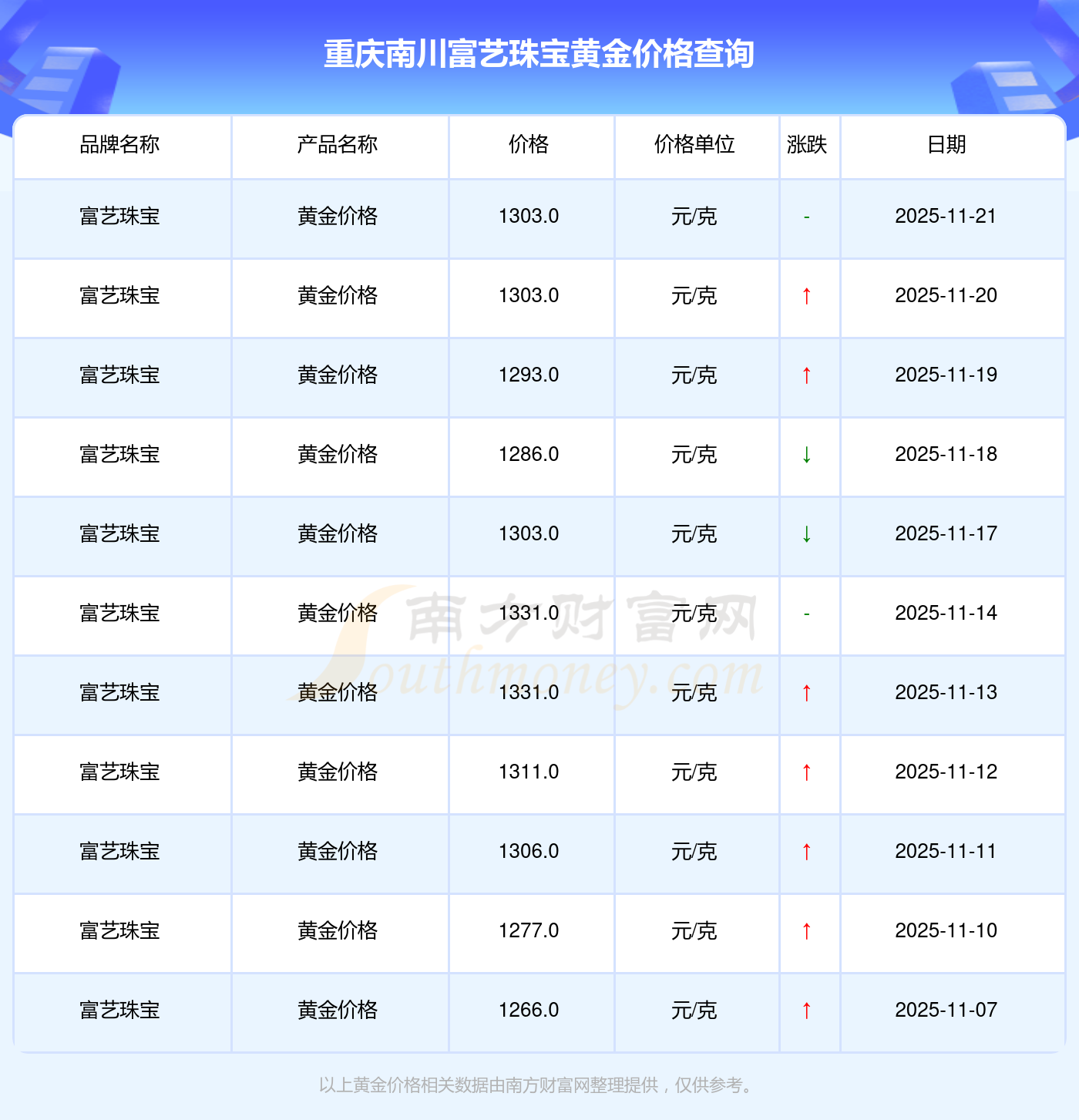 今日(2025年11月21日),重庆南川富艺珠宝黄金价格:1303.0元/克。