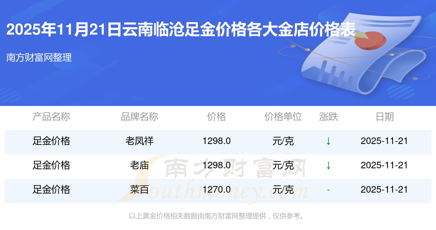 2025年11月21日云南临沧周大福、周大福、周大福、周大福、周大福、周大福、周大福、老凤祥、老凤祥、老凤祥、周六福等各大金店品牌足金价格最新价格如下:周大福黄金价格1305.0元/克,周大福铂金价格616.0元/克,周大福饰品金价(内地)1305.0元/克,周大福黄金饰品(香港)45110.0,周大福铂金价格(香港)17570.0,周大福金条价格(香港)40690.0,周大福金条金价(内地)1143.0元/克,老凤祥黄金价格1298.0元/克,老凤祥铂金价格600.0元/克,老凤祥足金价格1298.0元/克,周六福黄金价格1266.0元/克。