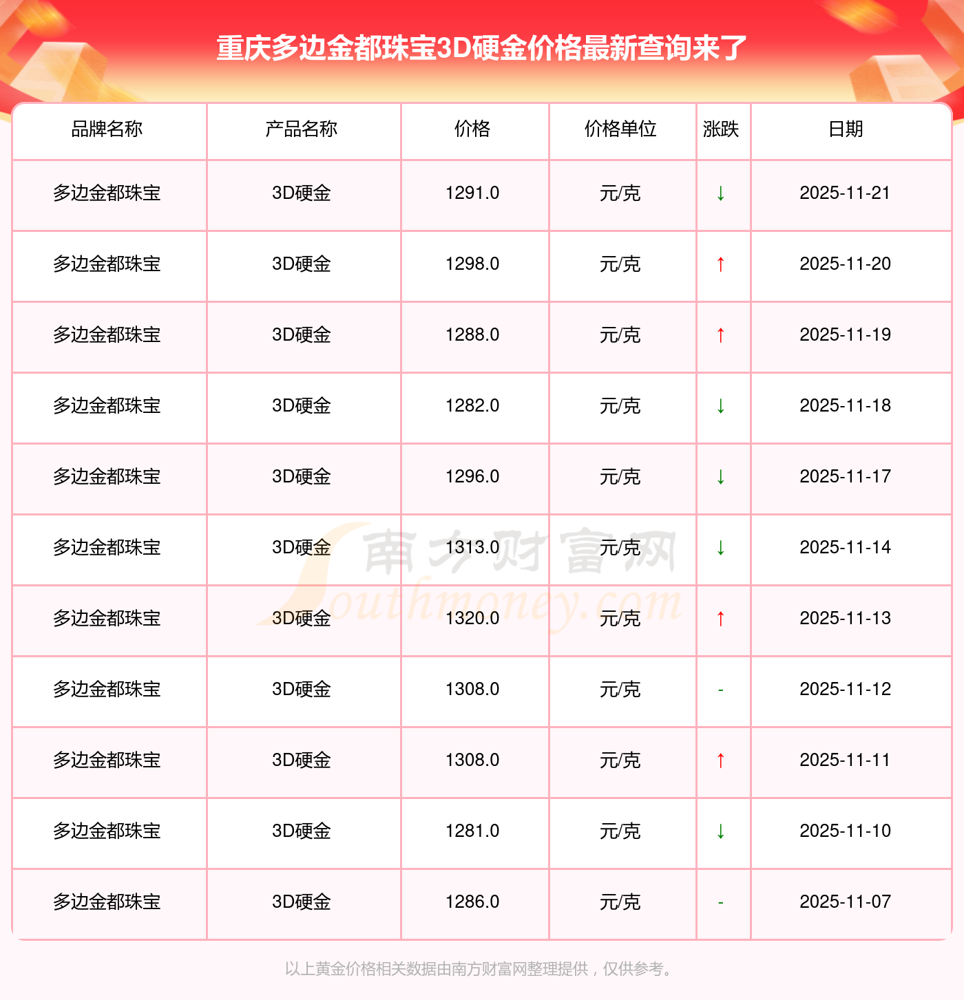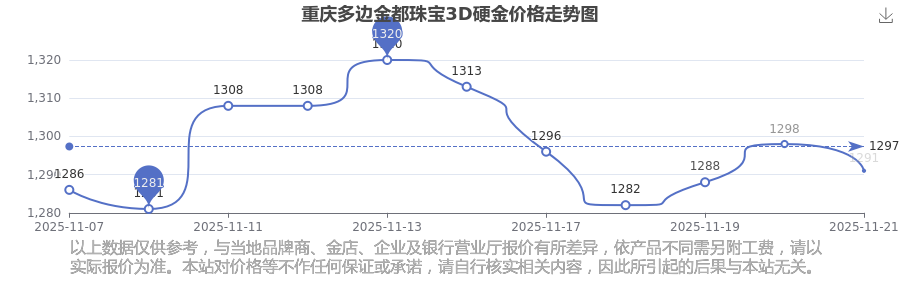 今日重庆多边金都珠宝3D硬金最新价格是1291.0元/克。