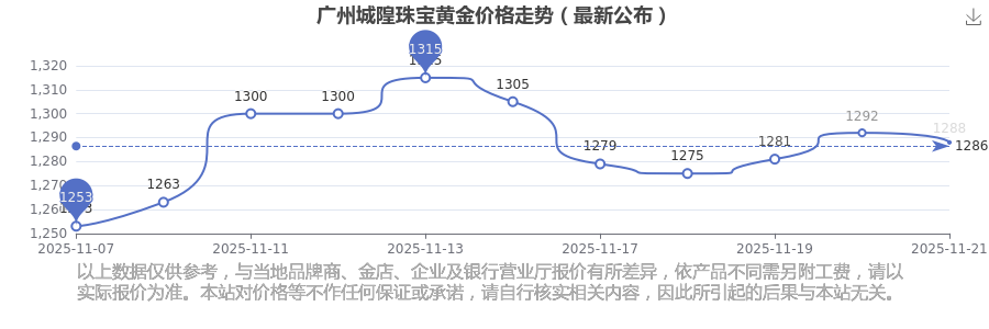 今日广州城隍珠宝黄金价格是1288.0元/克。