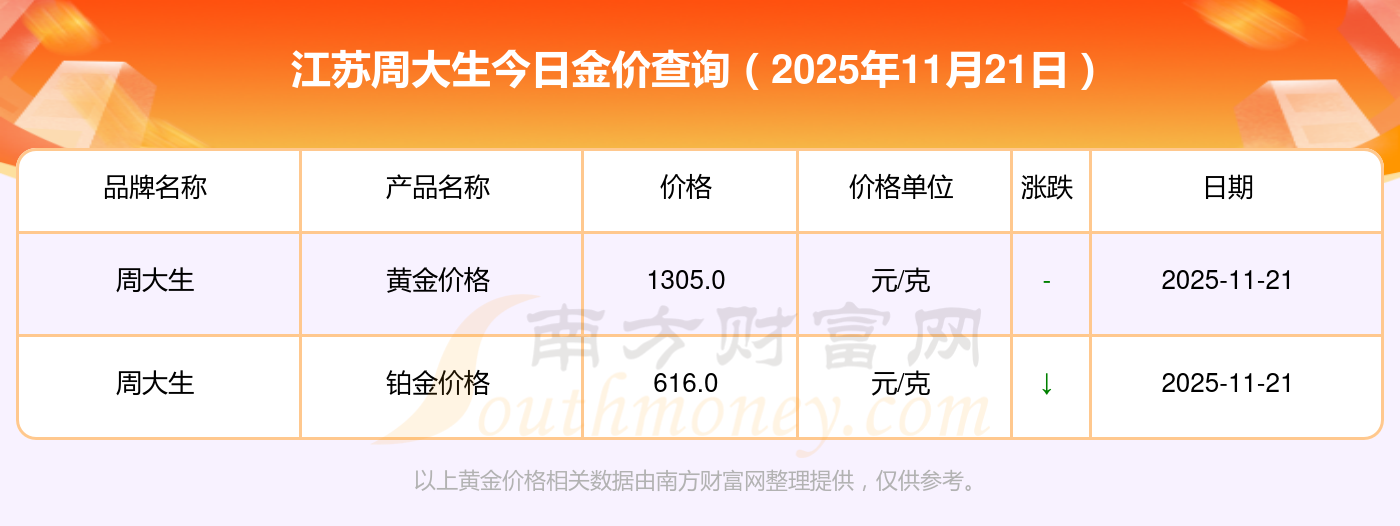 今日黄金价格查询_现在金价黄金一克多少钱,黄金价格是多少钱一克?2025年11月21日江苏周大生一克黄金的售价是多少:黄金价格1305.0元/克,铂金价格616.0元/克,饰品金价(内地)1305.0元/克,黄金饰品(香港)45110.0,铂金价格(香港)17570.0,金条价格(香港)40690.0,金条金价(内地)1143.0元/克,黄金价格1298.0元/克,铂金价格600.0元/克,足金价格1298.0元/克,黄金价格1266.0元/克。