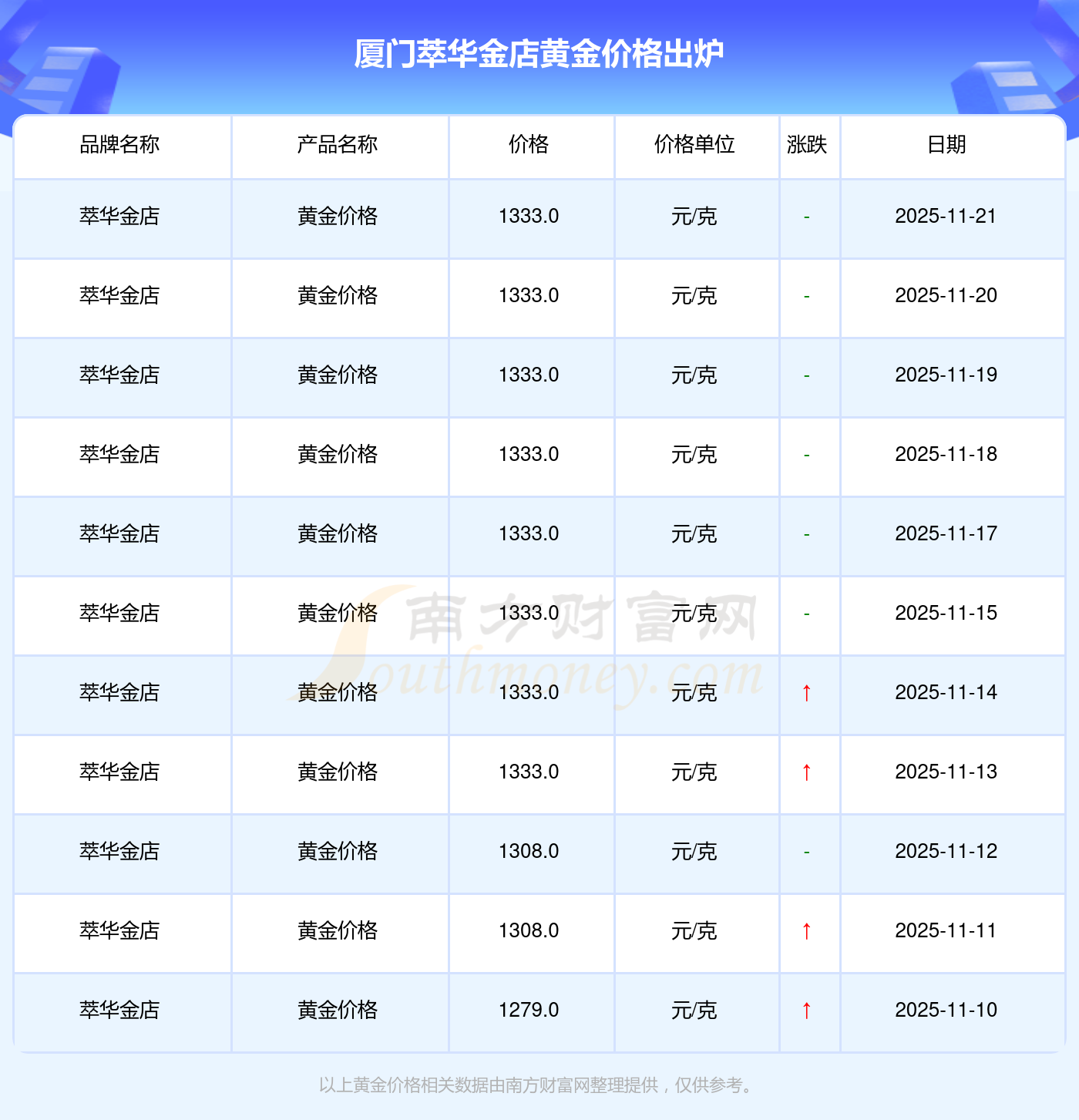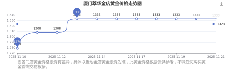 今日(2025年11月21日)厦门萃华金店黄金价格是1333.0元/克。