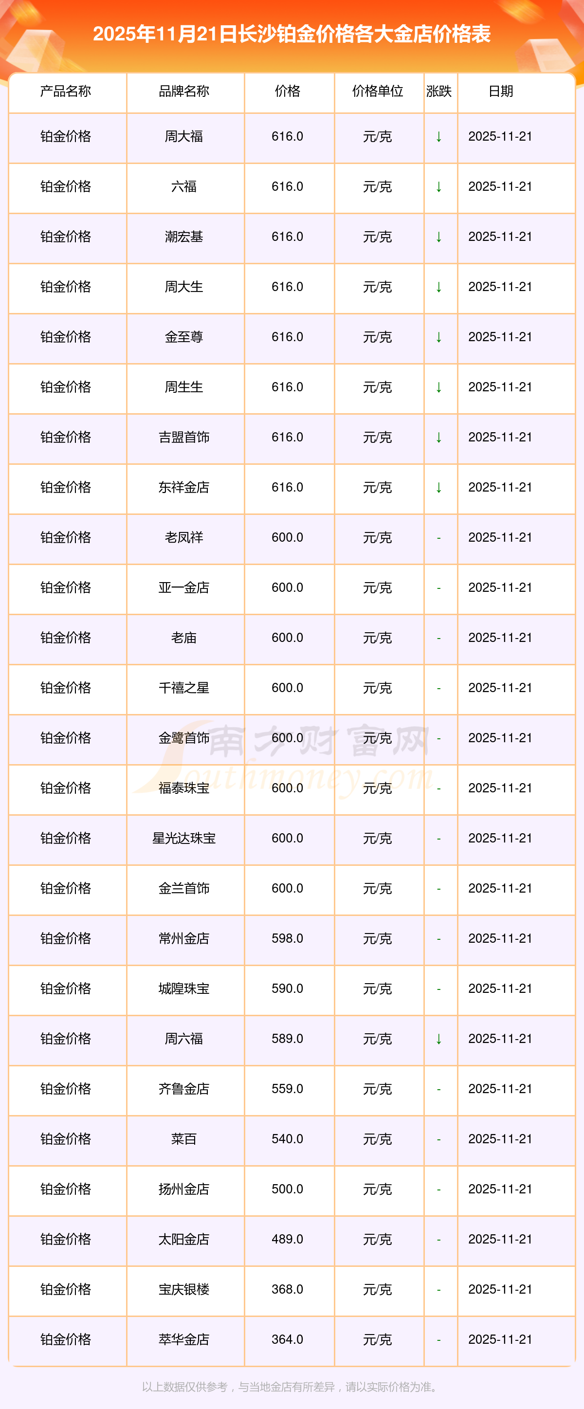 2025年11月21日,长沙周大福、周大福、周大福、周大福、周大福、周大福、周大福、老凤祥、老凤祥、老凤祥、周六福等各大金店品牌铂金价格今日价格如下:周大福1305.0元/克、周大福616.0元/克、周大福1305.0元/克、周大福45110.0、周大福17570.0、周大福40690.0、周大福1143.0元/克、老凤祥1298.0元/克、老凤祥600.0元/克、老凤祥1298.0元/克、周六福1266.0元/克。