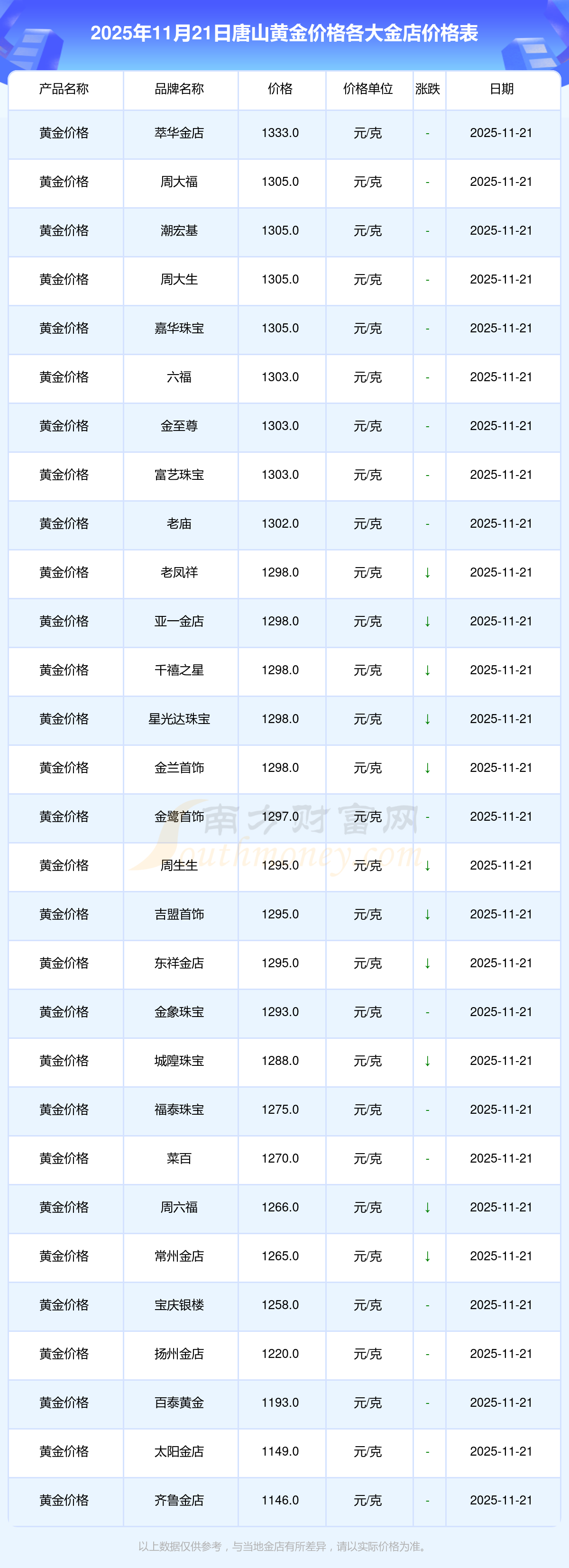 2025年11月21日唐山周大福、周大福、周大福、周大福、周大福、周大福、周大福、老凤祥、老凤祥、老凤祥、周六福等各大金店品牌黄金价格最新价格行情来了,如下:周大福黄金价格1305.0元/克,周大福铂金价格616.0元/克,周大福饰品金价(内地)1305.0元/克,周大福黄金饰品(香港)45110.0,周大福铂金价格(香港)17570.0,周大福金条价格(香港)40690.0,周大福金条金价(内地)1143.0元/克,老凤祥黄金价格1298.0元/克,老凤祥铂金价格600.0元/克,老凤祥足金价格1298.0元/克,周六福黄金价格1266.0元/克。