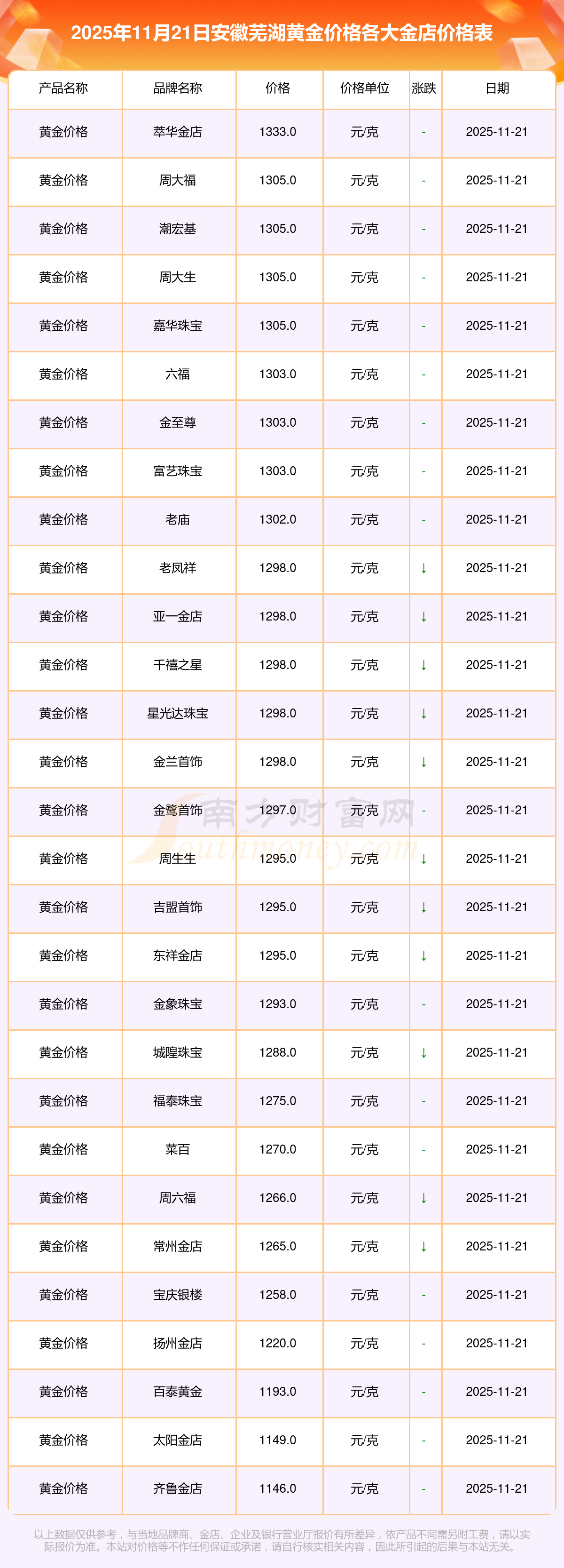 2025年11月21日安徽芜湖各大金店黄金价格最新价格查询来了:周大福1305.0元/克,周大福616.0元/克,周大福1305.0元/克,周大福45110.0,周大福17570.0,周大福40690.0,周大福1143.0元/克,老凤祥1298.0元/克,老凤祥600.0元/克,老凤祥1298.0元/克,周六福1266.0元/克。