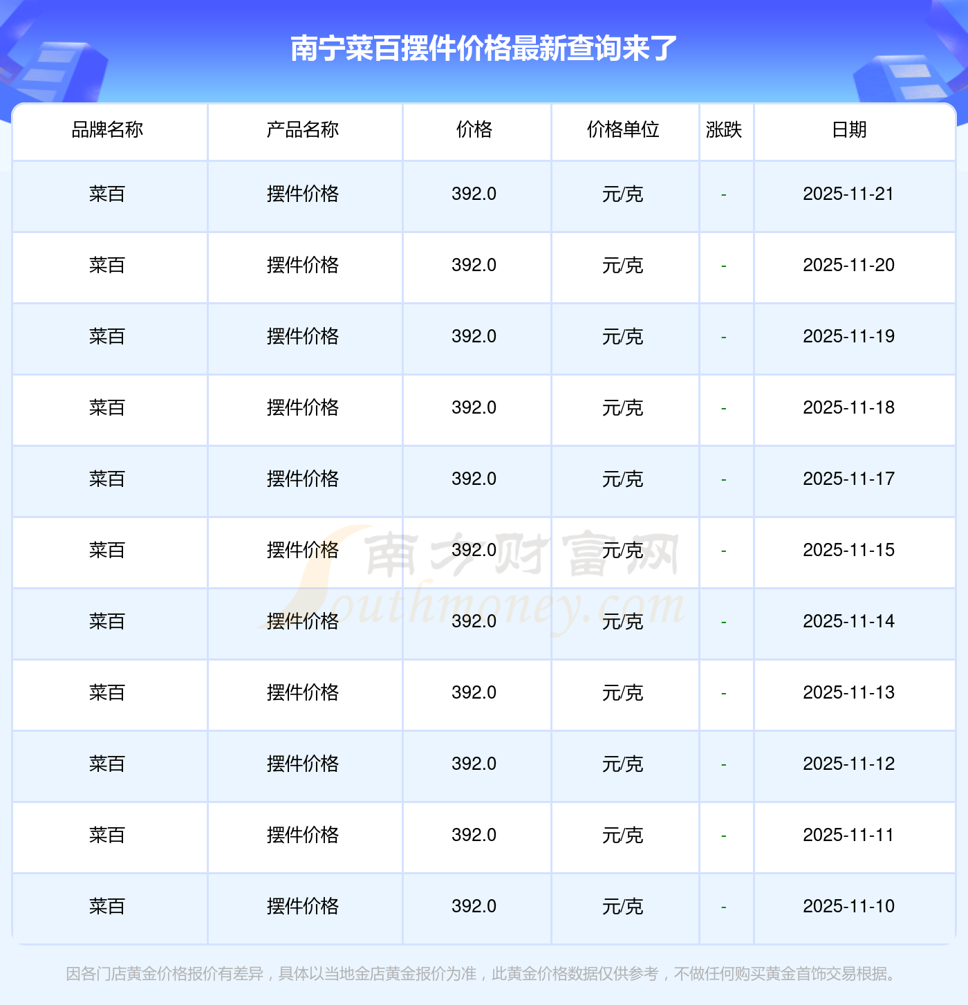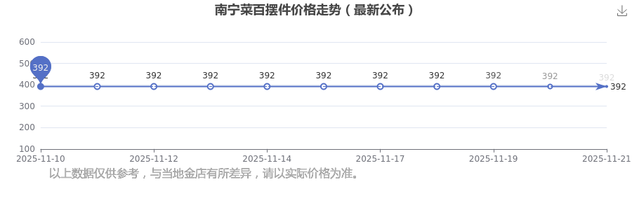 (2025年11月21日)今日南宁菜百摆件价格是392.0元/克。