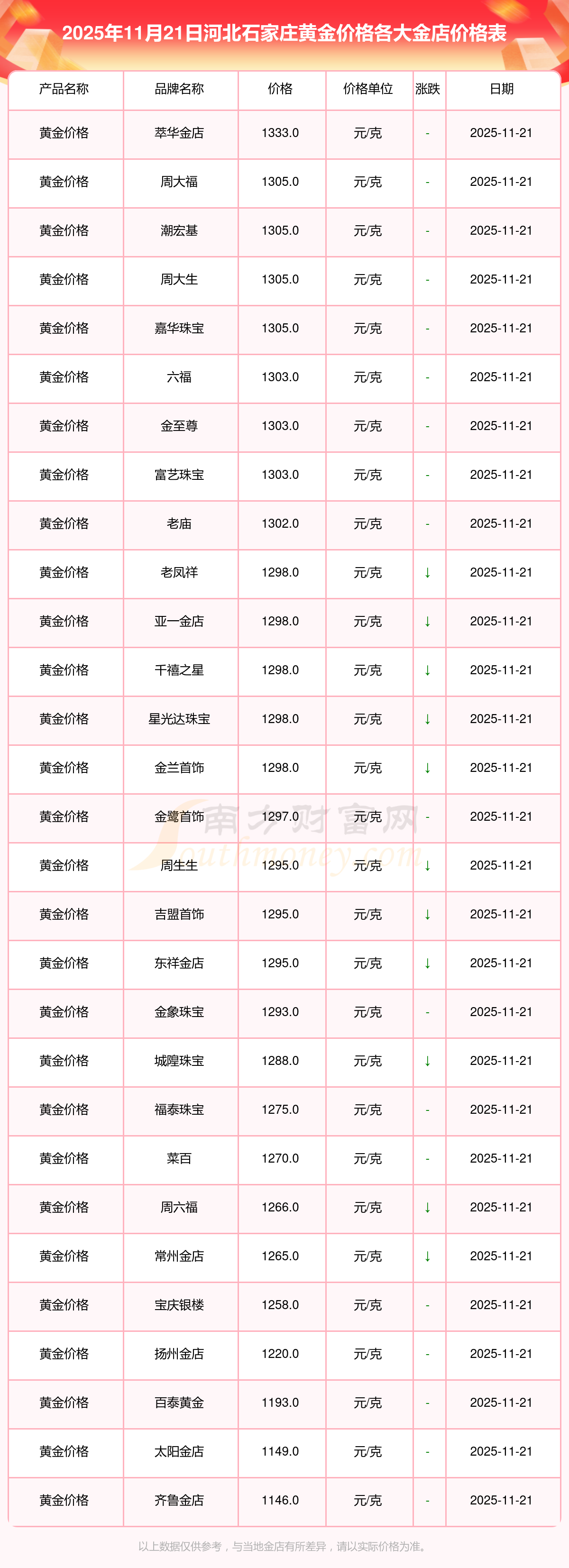 2025年11月21日河北石家庄周大福、周大福、周大福、周大福、周大福、周大福、周大福、老凤祥、老凤祥、老凤祥、周六福等各大金店品牌黄金价格最新价格如下:周大福黄金价格1305.0元/克,周大福铂金价格616.0元/克,周大福饰品金价(内地)1305.0元/克,周大福黄金饰品(香港)45110.0,周大福铂金价格(香港)17570.0,周大福金条价格(香港)40690.0,周大福金条金价(内地)1143.0元/克,老凤祥黄金价格1298.0元/克,老凤祥铂金价格600.0元/克,老凤祥足金价格1298.0元/克,周六福黄金价格1266.0元/克。