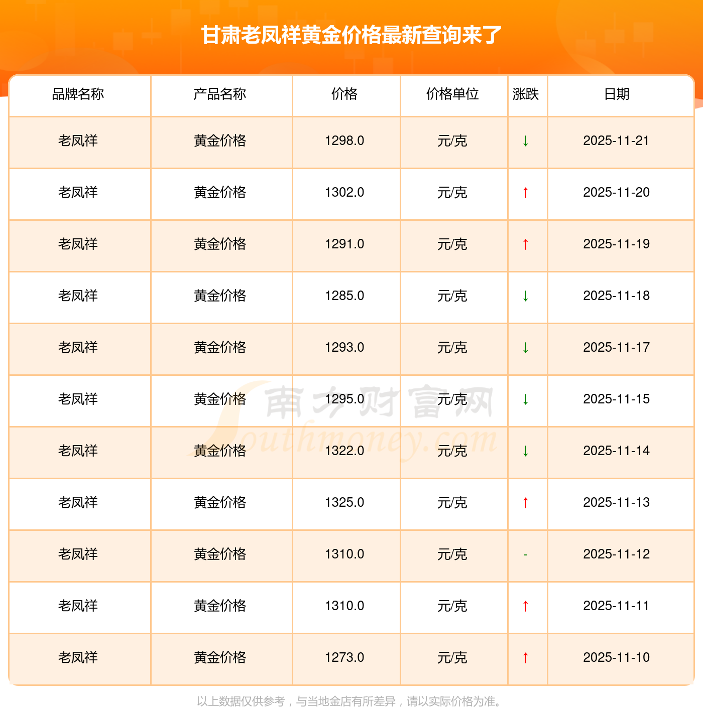 以上数据仅供参考,与当地金店有所差异,请以实际价格为准。