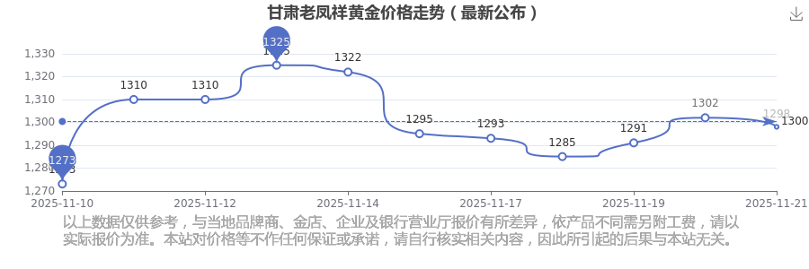 甘肃老凤祥 2025年11月21日的黄金价格价位为 1298.0元/克。
