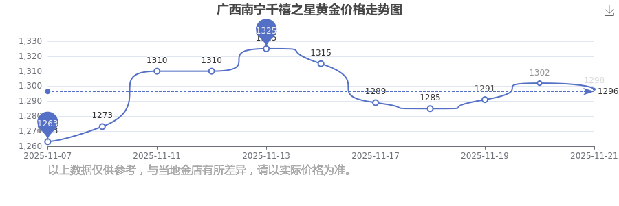 广西南宁千禧之星现在黄金价格每克多少?今日一克黄金的价格行情如何?今日广西南宁千禧之星黄金价格查询,今日(2025年11月21日),广西南宁千禧之星黄金价格:1298.0元/克。