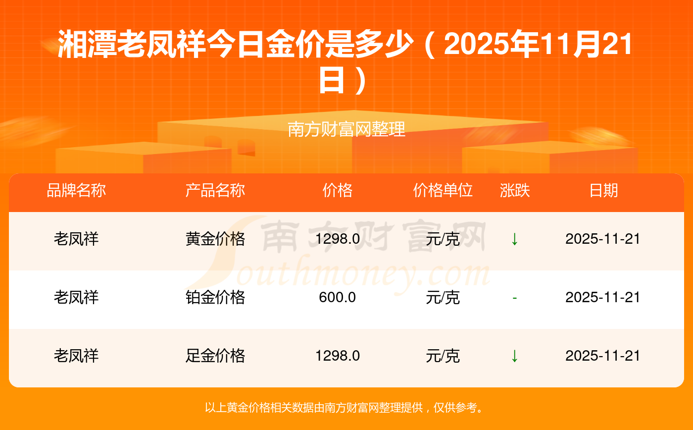 湘潭老凤祥金价今日价格:黄金价格1305.0元/克,铂金价格616.0元/克,饰品金价(内地)1305.0元/克,黄金饰品(香港)45110.0,铂金价格(香港)17570.0,金条价格(香港)40690.0,金条金价(内地)1143.0元/克,黄金价格1298.0元/克,铂金价格600.0元/克,足金价格1298.0元/克,黄金价格1266.0元/克。