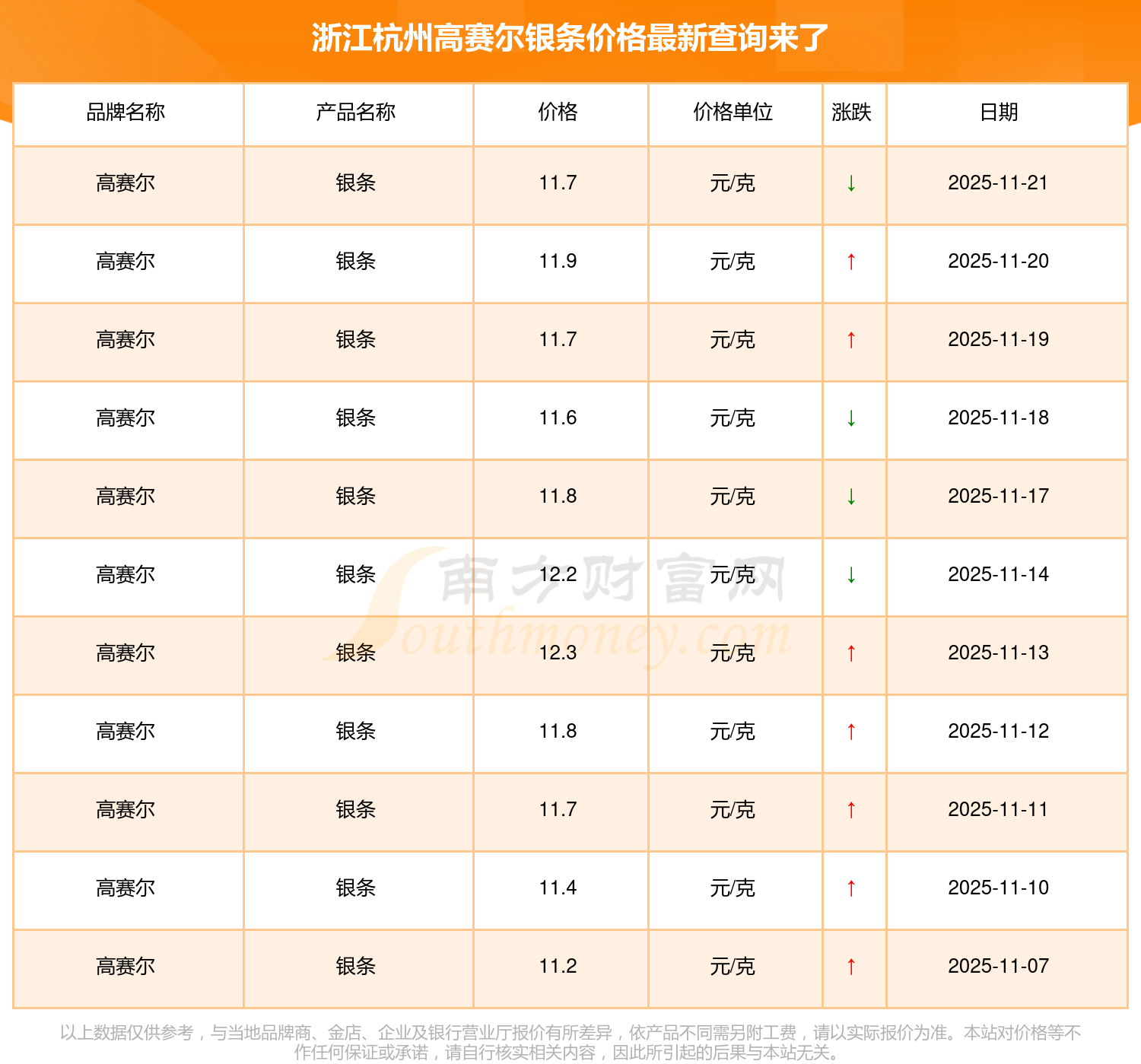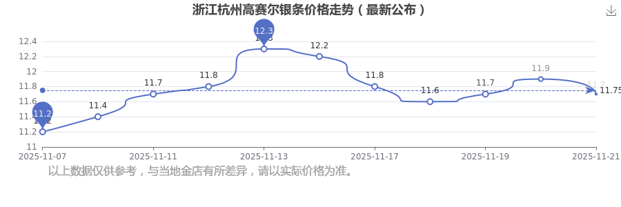 (2025年11月21日)浙江杭州高赛尔银条价格现在为11.7元/克。