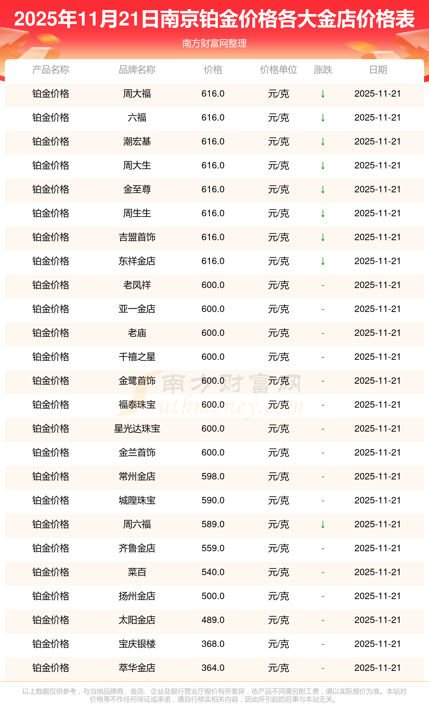 今天是2025年11月21日,南京周大福、周大福、周大福、周大福、周大福、周大福、周大福、老凤祥、老凤祥、老凤祥、周六福等各大金店品牌铂金价格最新价格行情是这样的:周大福1305.0元/克、周大福616.0元/克、周大福1305.0元/克、周大福45110.0、周大福17570.0、周大福40690.0、周大福1143.0元/克、老凤祥1298.0元/克、老凤祥600.0元/克、老凤祥1298.0元/克、周六福1266.0元/克。