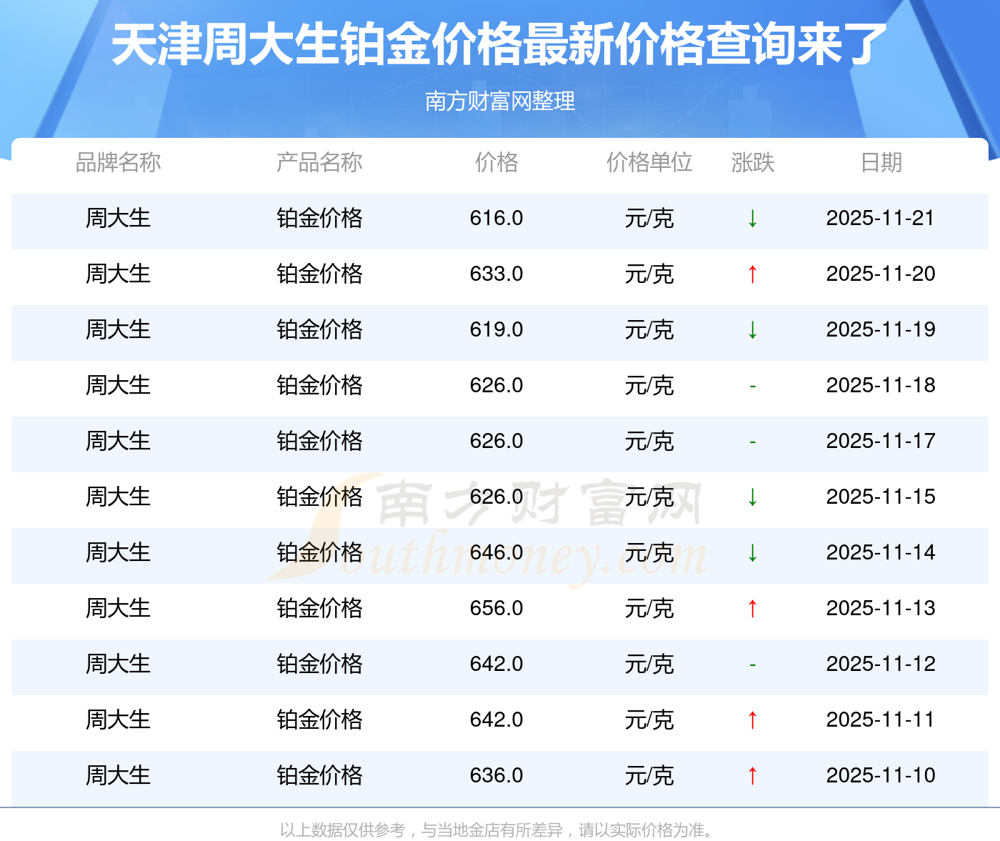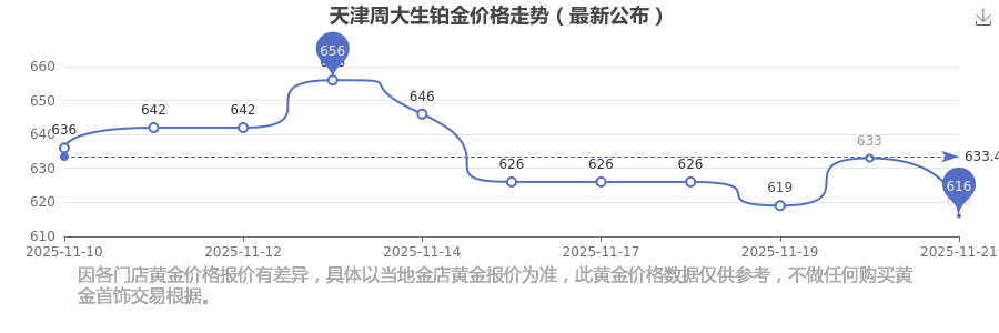 (2025年11月21日)今日天津周大生铂金价格是616.0元/克。