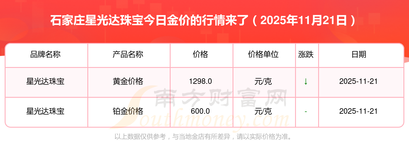 2025年11月21日石家庄星光达珠宝一克黄金的售价是多少:黄金价格1305.0元/克,铂金价格616.0元/克,饰品金价(内地)1305.0元/克,黄金饰品(香港)45110.0,铂金价格(香港)17570.0,金条价格(香港)40690.0,金条金价(内地)1143.0元/克,黄金价格1298.0元/克,铂金价格600.0元/克,足金价格1298.0元/克,黄金价格1266.0元/克。