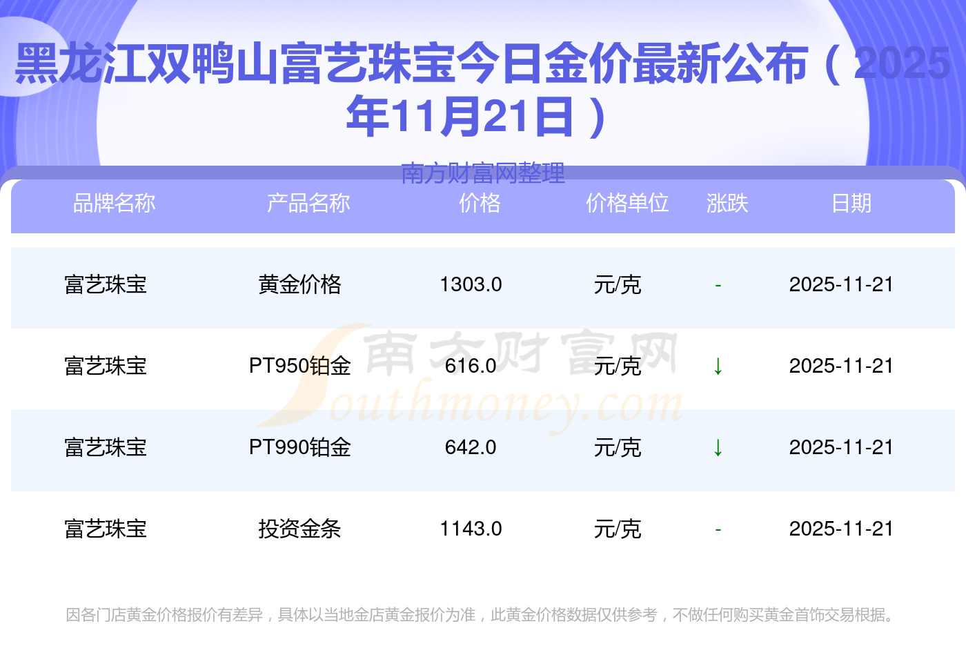 黑龙江双鸭山富艺珠宝金价今日价格:黄金价格1305.0元/克,铂金价格616.0元/克,饰品金价(内地)1305.0元/克,黄金饰品(香港)45110.0,铂金价格(香港)17570.0,金条价格(香港)40690.0,金条金价(内地)1143.0元/克,黄金价格1298.0元/克,铂金价格600.0元/克,足金价格1298.0元/克,黄金价格1266.0元/克。