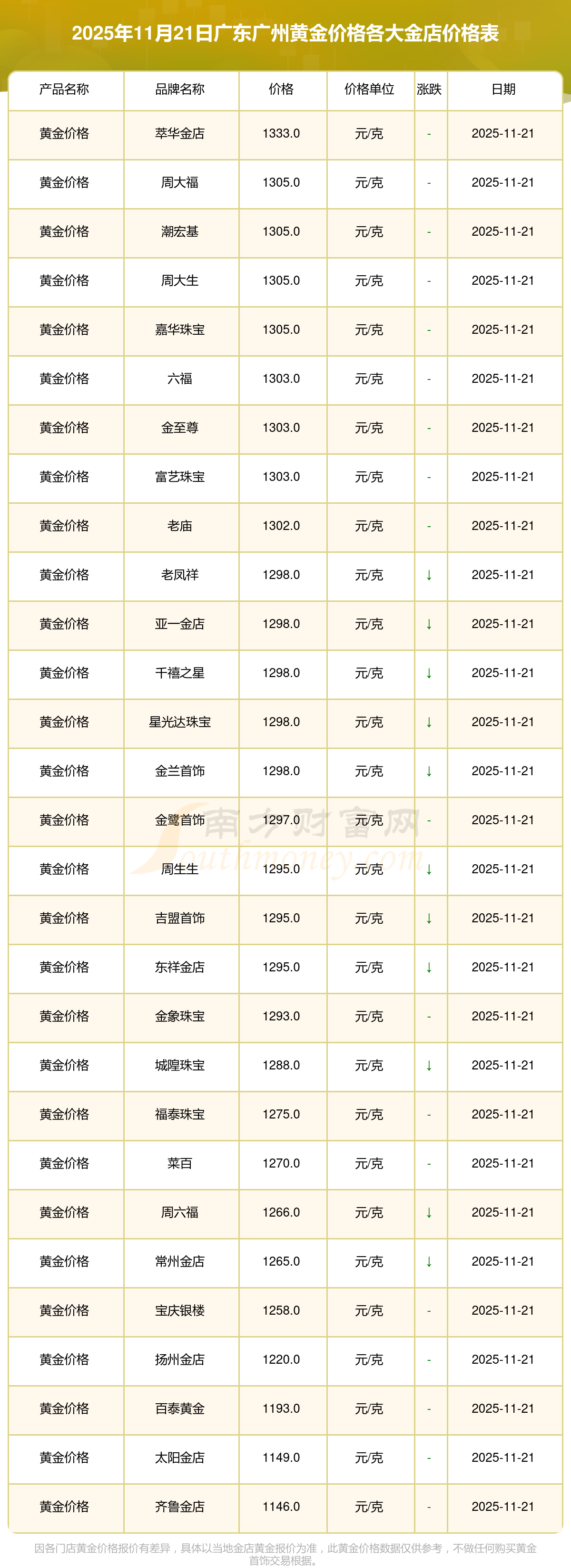 2025年11月21日,广东广州周大福、周大福、周大福、周大福、周大福、周大福、周大福、老凤祥、老凤祥、老凤祥、周六福等各大金店品牌黄金价格今日价格行情最新来了:周大福1305.0元/克、周大福616.0元/克、周大福1305.0元/克、周大福45110.0、周大福17570.0、周大福40690.0、周大福1143.0元/克、老凤祥1298.0元/克、老凤祥600.0元/克、老凤祥1298.0元/克、周六福1266.0元/克。
