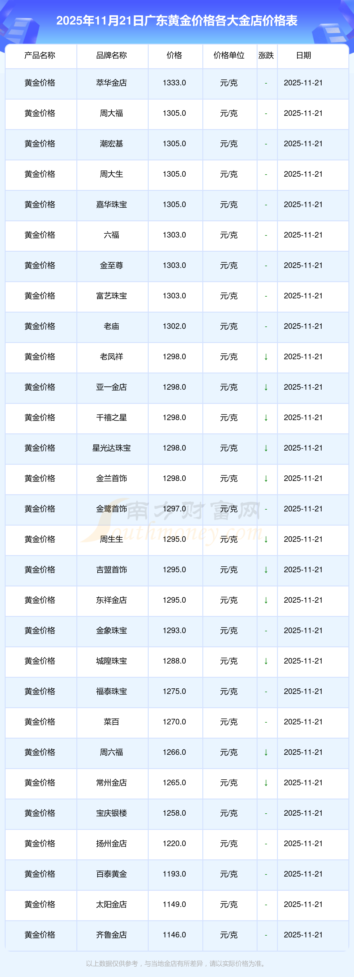 2025年11月21日,广东周大福、周大福、周大福、周大福、周大福、周大福、周大福、老凤祥、老凤祥、老凤祥、周六福等各大金店品牌黄金价格今日价格行情最新来了:周大福1305.0元/克、周大福616.0元/克、周大福1305.0元/克、周大福45110.0、周大福17570.0、周大福40690.0、周大福1143.0元/克、老凤祥1298.0元/克、老凤祥600.0元/克、老凤祥1298.0元/克、周六福1266.0元/克。