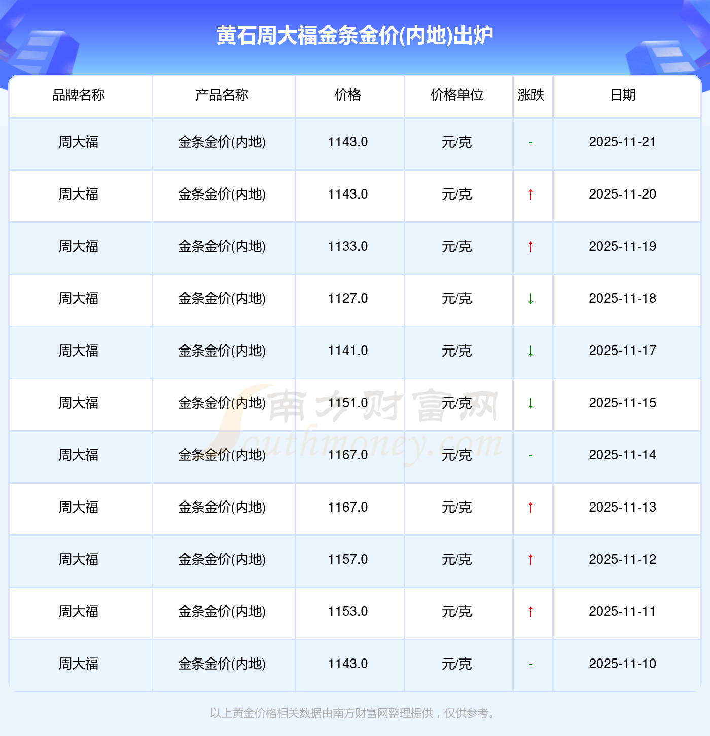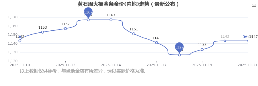 今日(2025年11月21日),黄石周大福金条金价(内地)每克的价值为1143.0元/克。