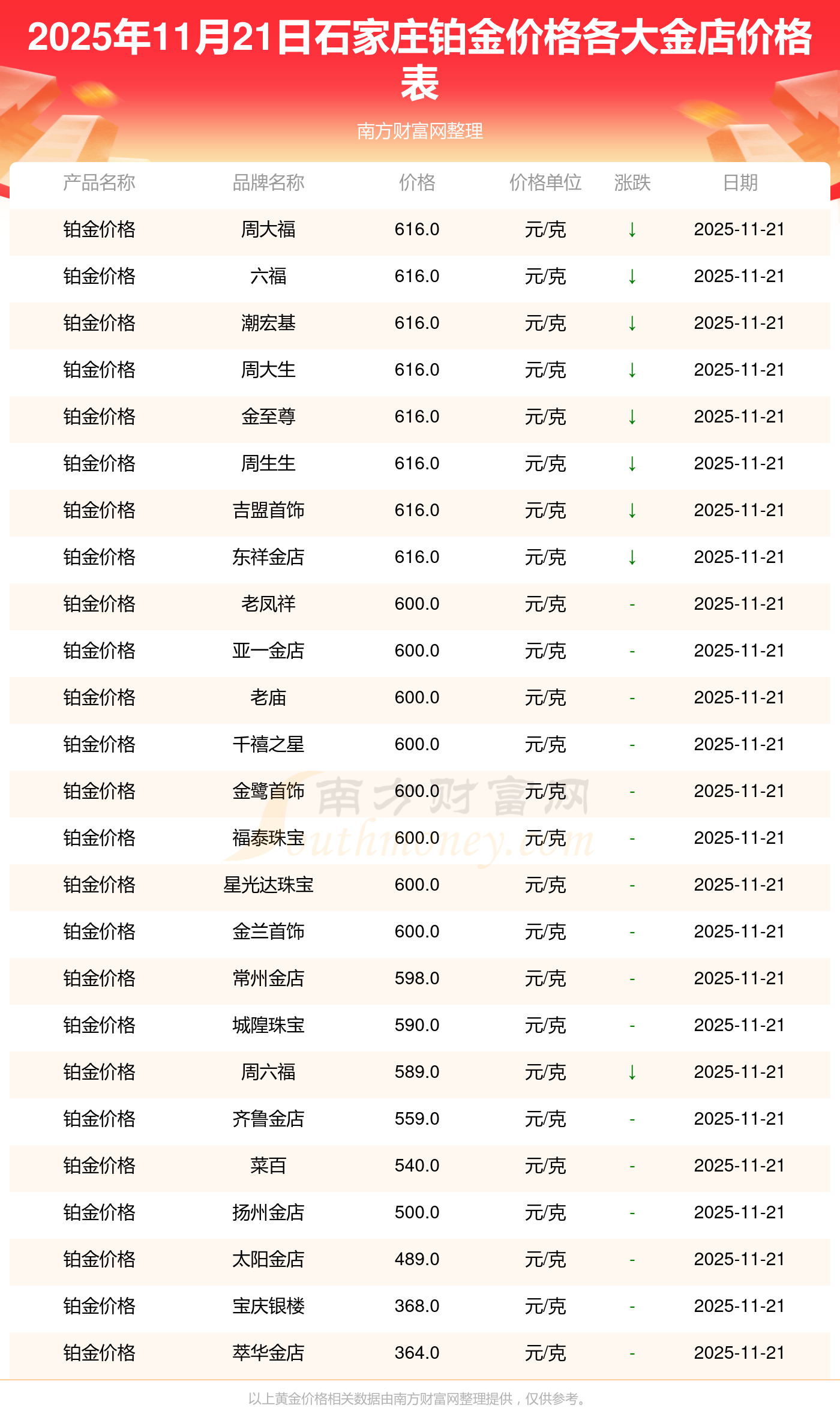 今天是2025年11月21日,石家庄周大福、周大福、周大福、周大福、周大福、周大福、周大福、老凤祥、老凤祥、老凤祥、周六福等各大金店品牌铂金价格最新价格如下:周大福1305.0元/克、周大福616.0元/克、周大福1305.0元/克、周大福45110.0、周大福17570.0、周大福40690.0、周大福1143.0元/克、老凤祥1298.0元/克、老凤祥600.0元/克、老凤祥1298.0元/克、周六福1266.0元/克。