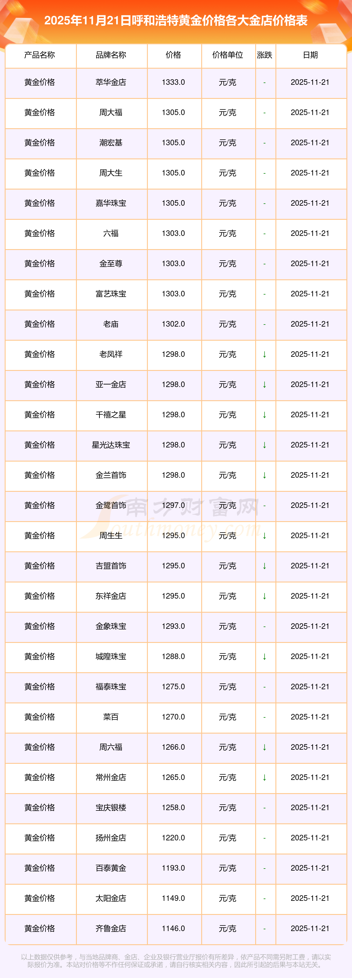 2025年11月21日呼和浩特各大金店黄金价格最新价格查询来了:周大福1305.0元/克,周大福616.0元/克,周大福1305.0元/克,周大福45110.0,周大福17570.0,周大福40690.0,周大福1143.0元/克,老凤祥1298.0元/克,老凤祥600.0元/克,老凤祥1298.0元/克,周六福1266.0元/克。