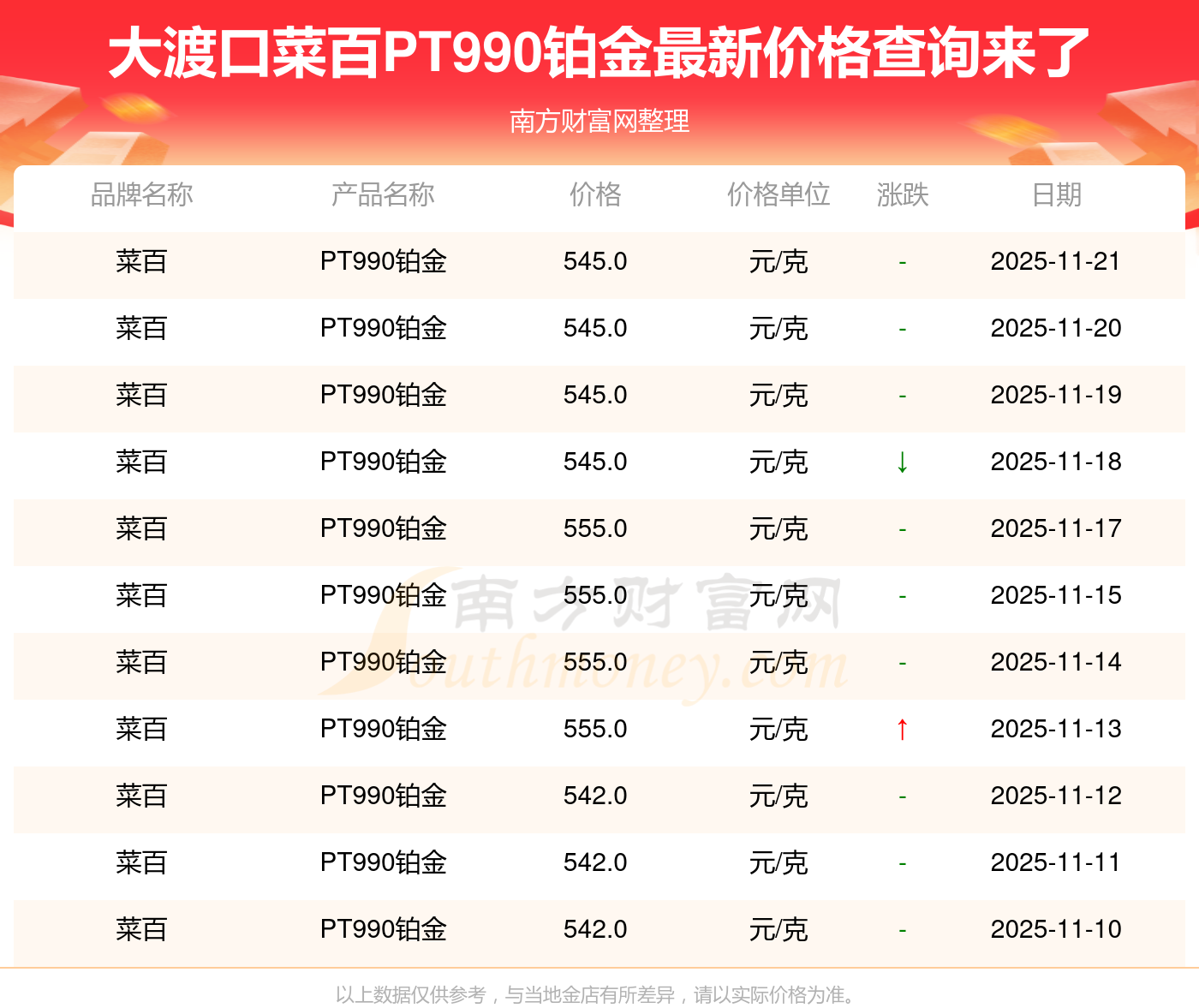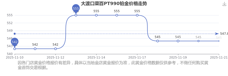 大渡口菜百 2025年11月21日的PT990铂金价位为 545.0元/克。