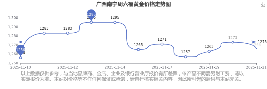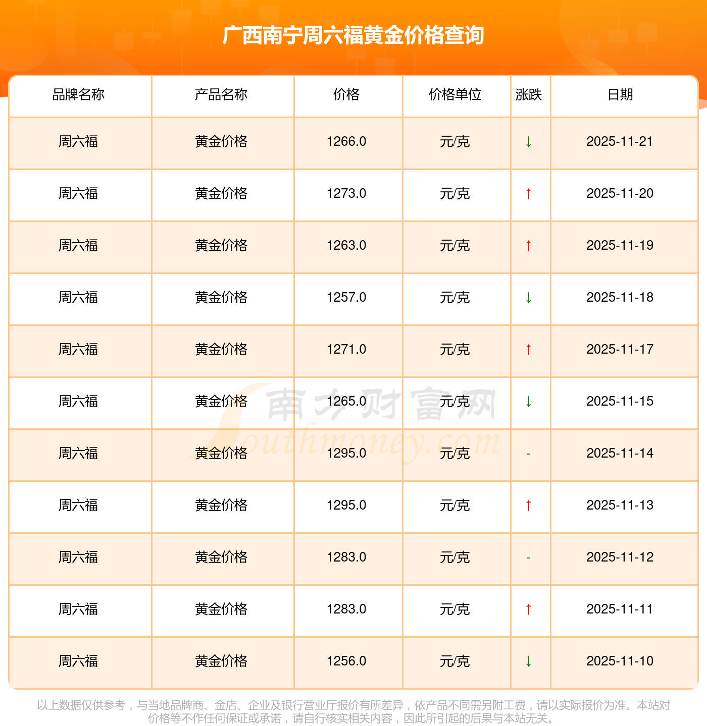 2025年11月21日,广西南宁周六福黄金价格每克的价值量定格在1266.0元/克。