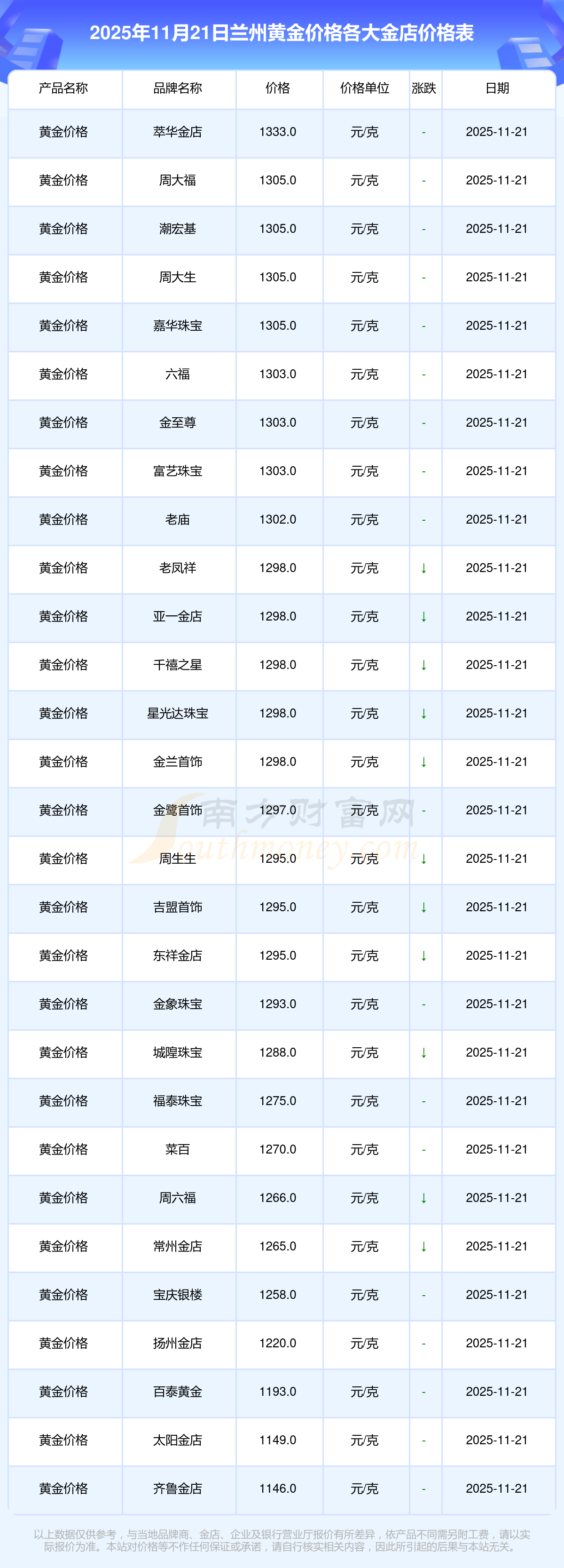 今天是2025年11月21日,兰州周大福、周大福、周大福、周大福、周大福、周大福、周大福、老凤祥、老凤祥、老凤祥、周六福等各大金店品牌黄金价格最新价格行情是这样的:周大福1305.0元/克、周大福616.0元/克、周大福1305.0元/克、周大福45110.0、周大福17570.0、周大福40690.0、周大福1143.0元/克、老凤祥1298.0元/克、老凤祥600.0元/克、老凤祥1298.0元/克、周六福1266.0元/克。