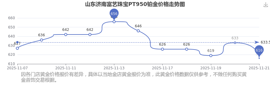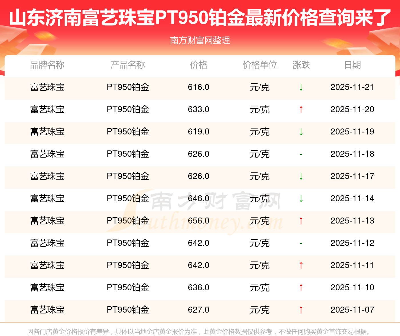 山东济南富艺珠宝在 2025年11月21日,PT950铂金的售卖价格是 616.0元/克。
