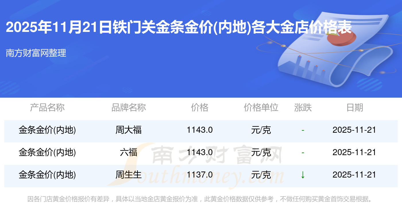 2025年11月21日铁门关各大金店金条金价(内地)最新价格查询来了:周大福1305.0元/克,周大福616.0元/克,周大福1305.0元/克,周大福45110.0,周大福17570.0,周大福40690.0,周大福1143.0元/克,老凤祥1298.0元/克,老凤祥600.0元/克,老凤祥1298.0元/克,周六福1266.0元/克。