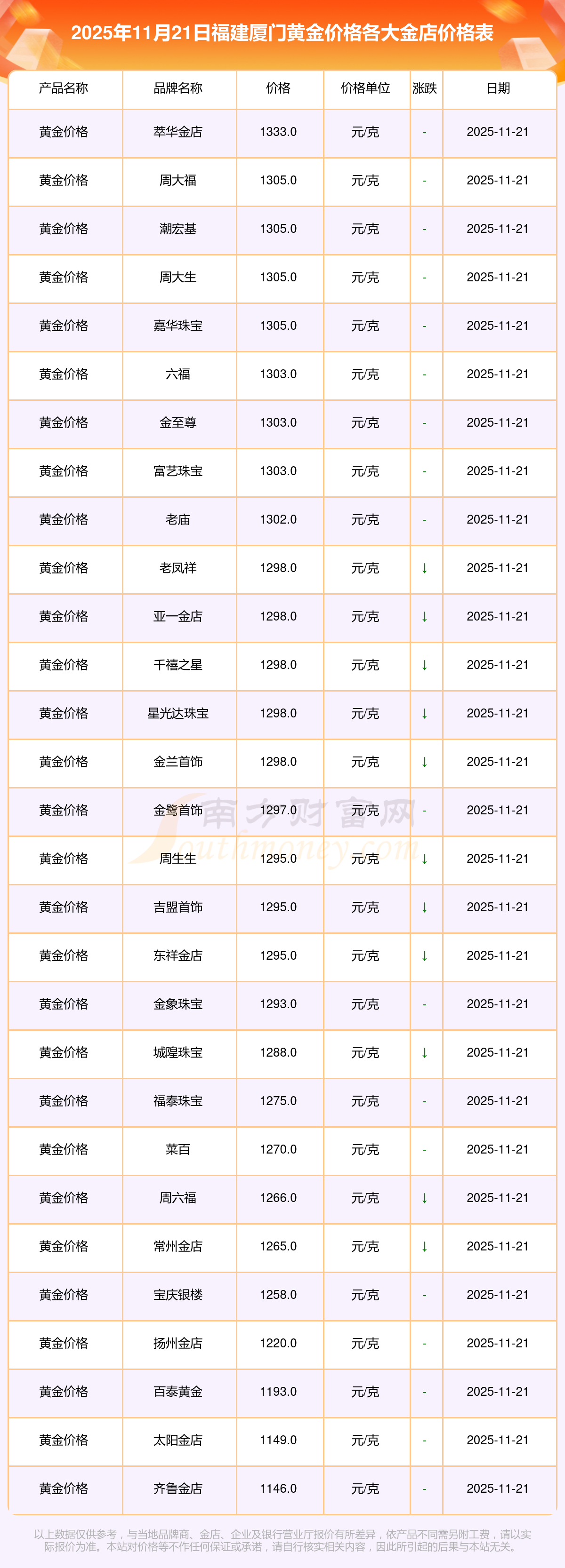 今天是2025年11月21日,福建厦门周大福、周大福、周大福、周大福、周大福、周大福、周大福、老凤祥、老凤祥、老凤祥、周六福等各大金店品牌黄金价格最新价格行情是这样的:周大福1305.0元/克、周大福616.0元/克、周大福1305.0元/克、周大福45110.0、周大福17570.0、周大福40690.0、周大福1143.0元/克、老凤祥1298.0元/克、老凤祥600.0元/克、老凤祥1298.0元/克、周六福1266.0元/克。