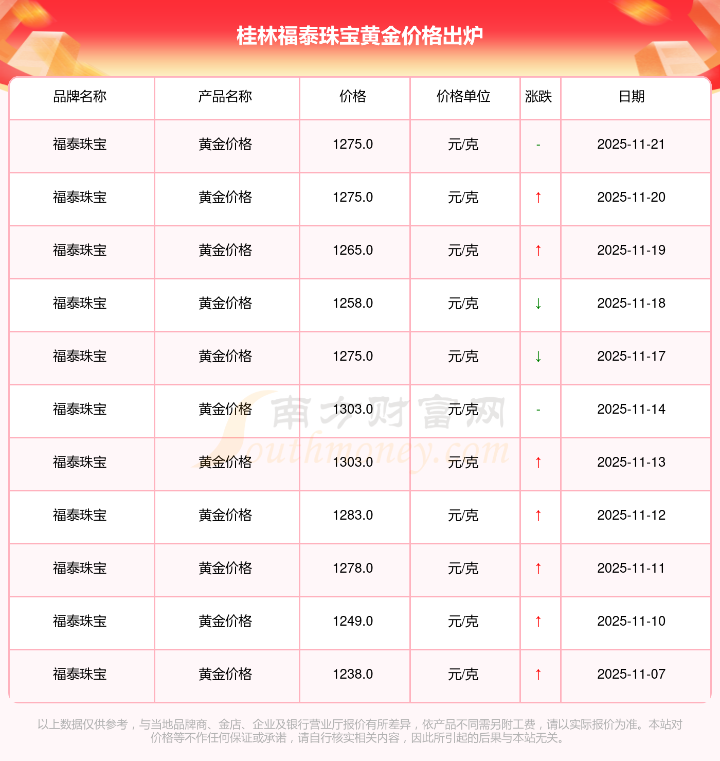 桂林福泰珠宝在 2025年11月21日的黄金价格零售价格为 1275.0元/克。