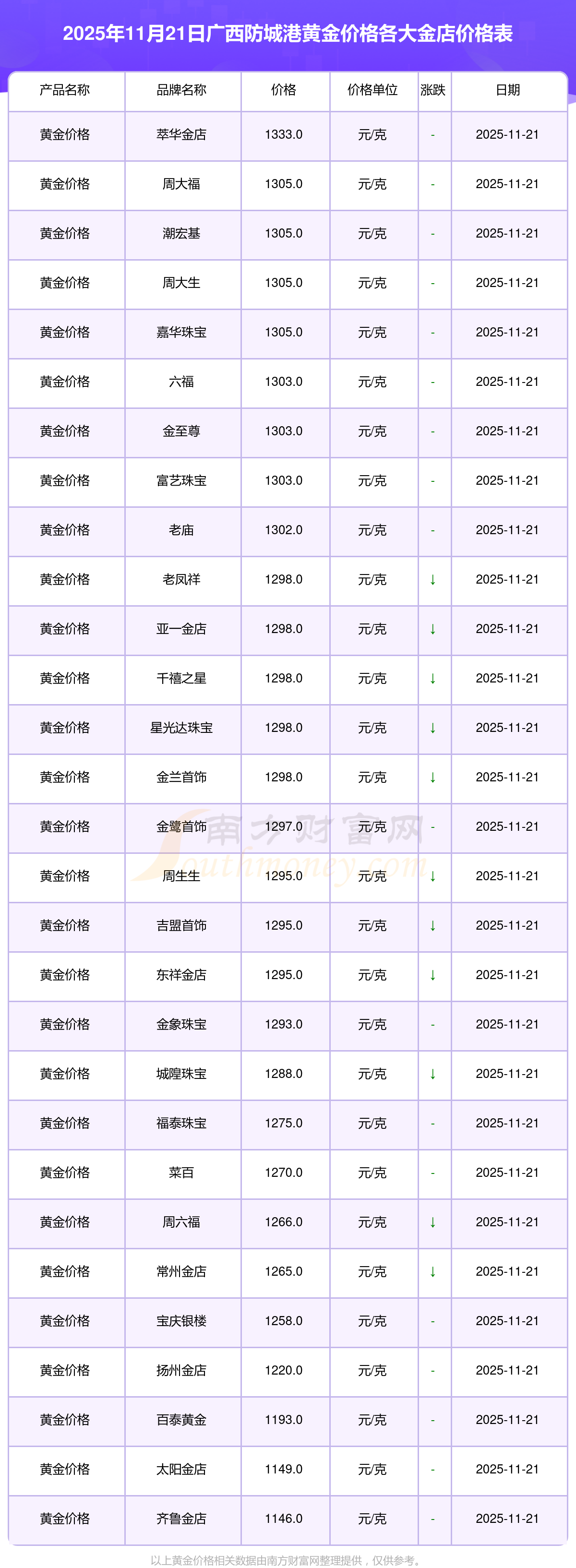 2025年11月21日广西防城港周大福、周大福、周大福、周大福、周大福、周大福、周大福、老凤祥、老凤祥、老凤祥、周六福等各大金店品牌黄金价格最新价格如下:周大福黄金价格1305.0元/克,周大福铂金价格616.0元/克,周大福饰品金价(内地)1305.0元/克,周大福黄金饰品(香港)45110.0,周大福铂金价格(香港)17570.0,周大福金条价格(香港)40690.0,周大福金条金价(内地)1143.0元/克,老凤祥黄金价格1298.0元/克,老凤祥铂金价格600.0元/克,老凤祥足金价格1298.0元/克,周六福黄金价格1266.0元/克。
